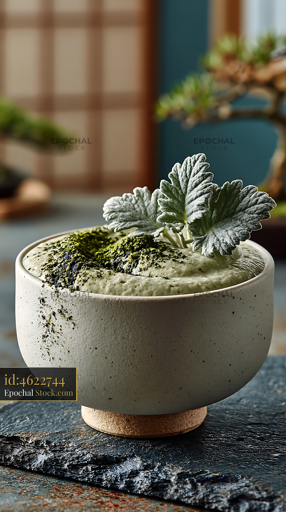 A healthy mugwort herb smoothie topped with green herbal powder and fresh leaves, served in a traditional ceramic bowl within a serene Zen-inspired setting with bonsai trees.