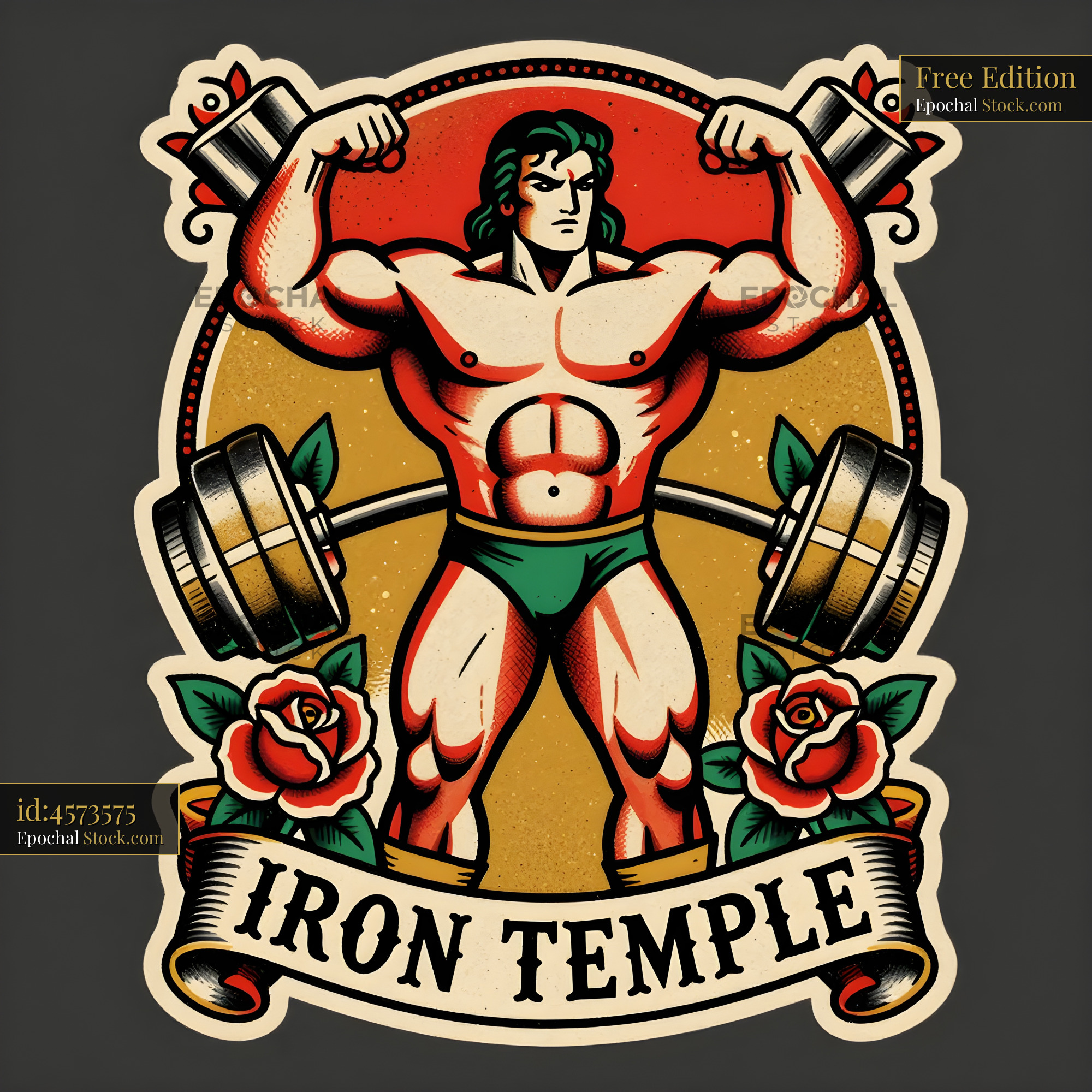 A strong man poses with weights in a gym. He has long hair and stands proudly. Roses are present in the design. This scene shows strength and dedication to fitness.