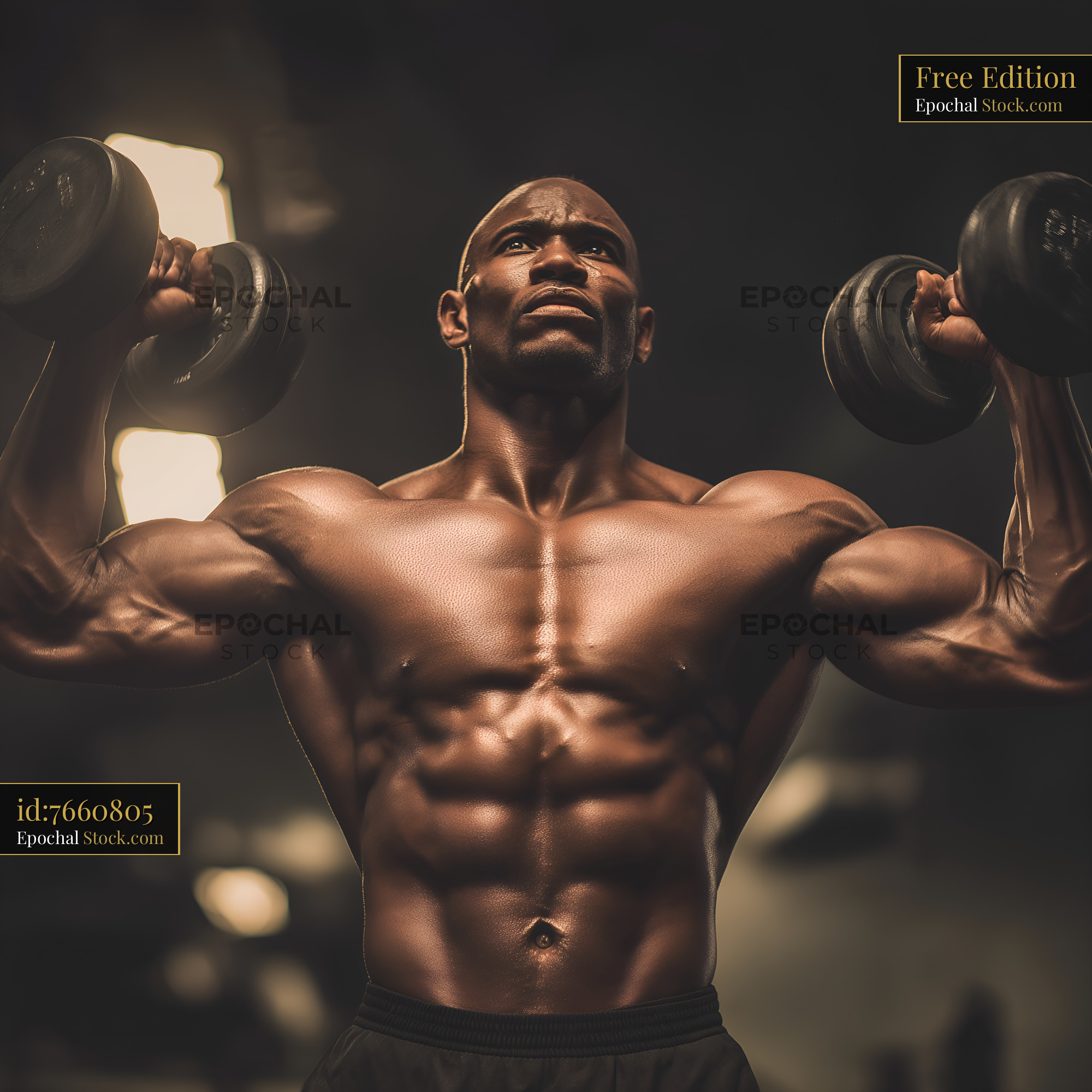 A man with a muscular build lifts dumbbells above his head in a gym. The background is dimly lit, focusing on his strong physique. He appears focused and determined during the workout.