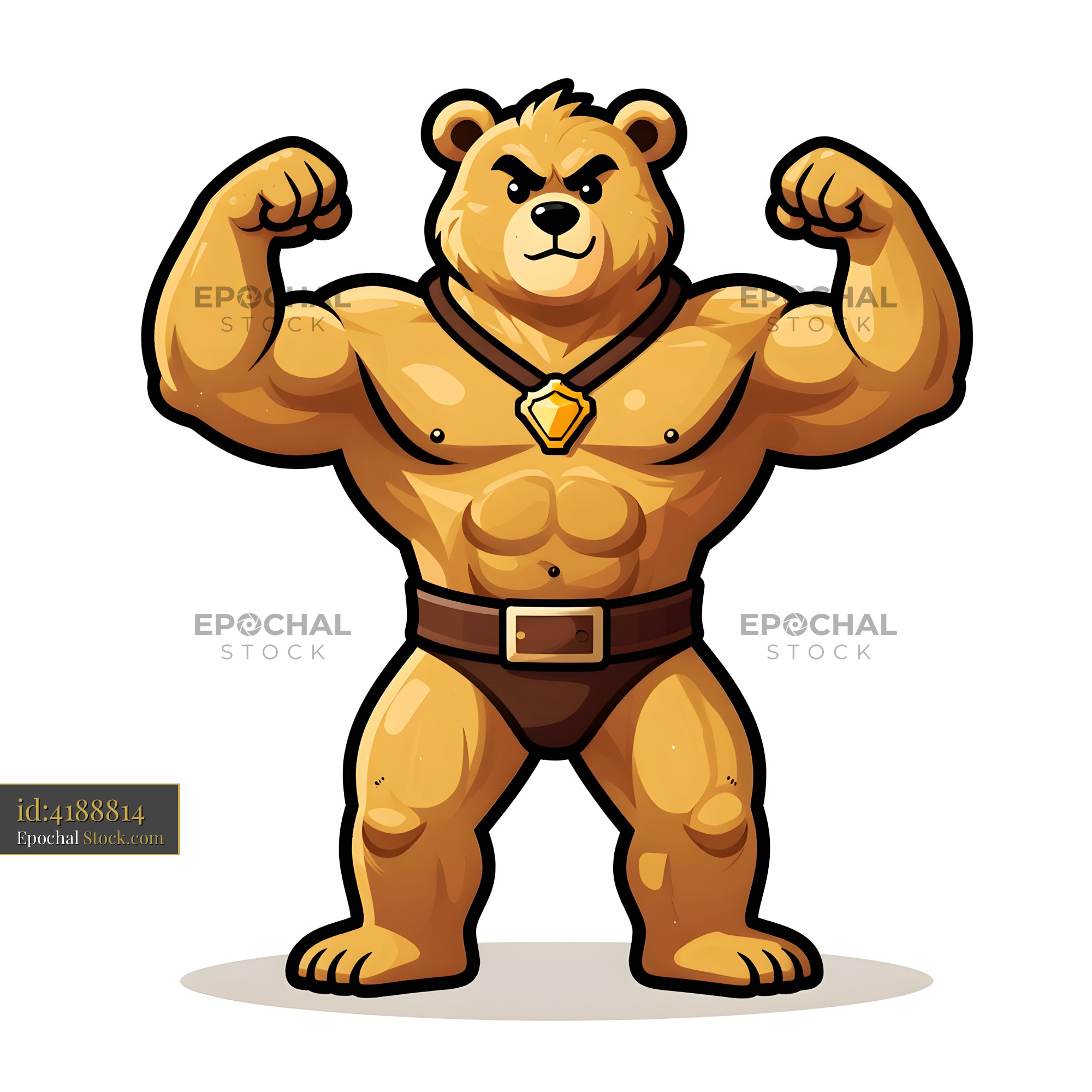 A strong bear stands proudly with flexed arms. It wears a medal around its neck. The bear shows confidence and power. The background is plain, focusing on the bear's stance and features.
