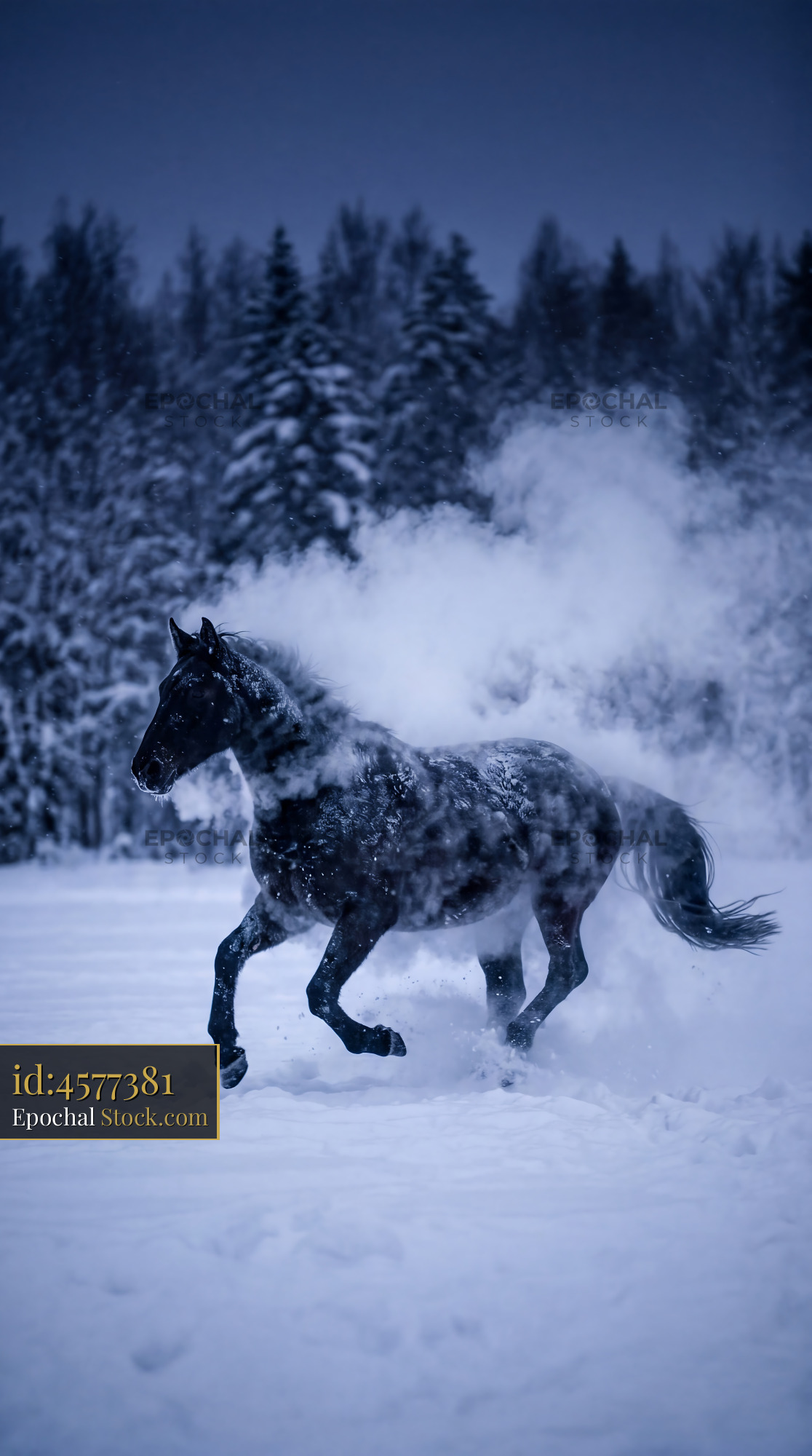 Mystical Indigo Horse Running in Winter Mist