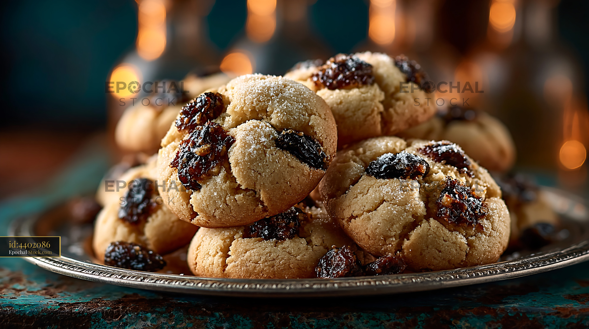 Traditional nan-e panjereh biscuits topped with raisins and sugar on a silver platter, evoking warm Persian hospitality and festive holiday celebrations with a cozy bokeh background.