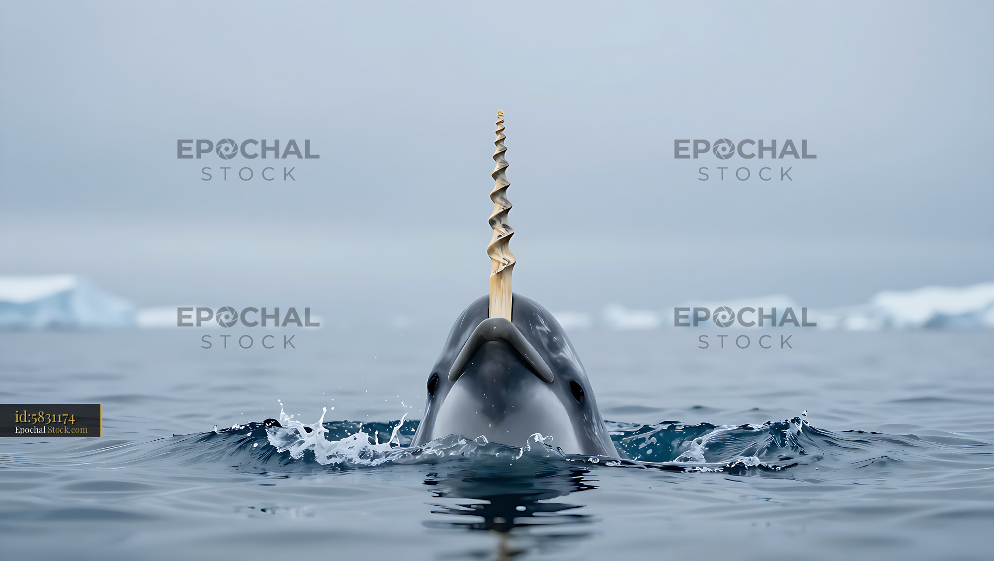 A majestic narwhal emerges from the cold Arctic ocean, its iconic spiraled tusk pointing skyward amidst splashing waves and distant icebergs under a moody sky.