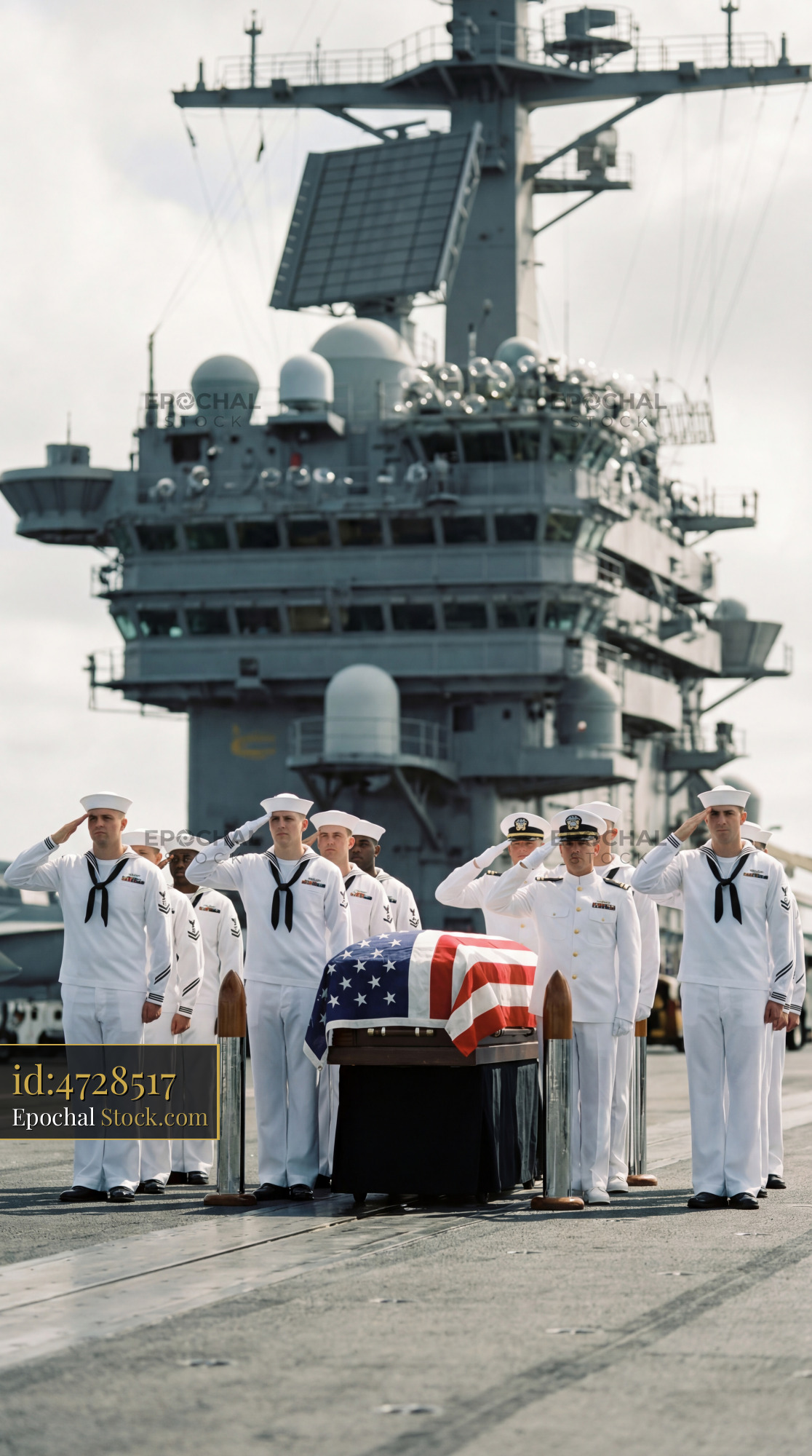 Sailors stand in formation and salute while a flag-draped casket is placed on the deck. The aircraft carrier is in the background. This ceremony shows respect and honor for a fallen service member.