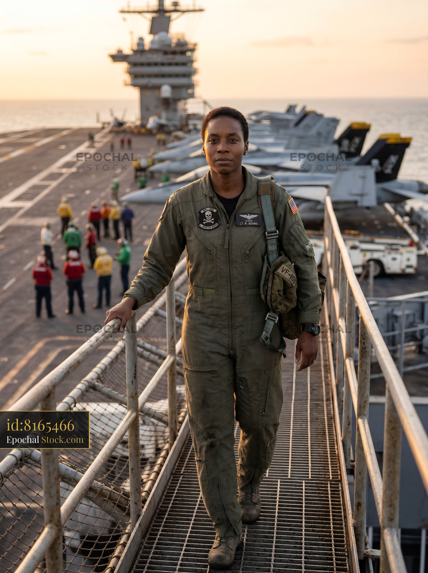 A navy pilot walks confidently on the deck of an aircraft carrier. The sun sets in the background, casting a warm glow. Several crew members are seen in the distance preparing for tasks.