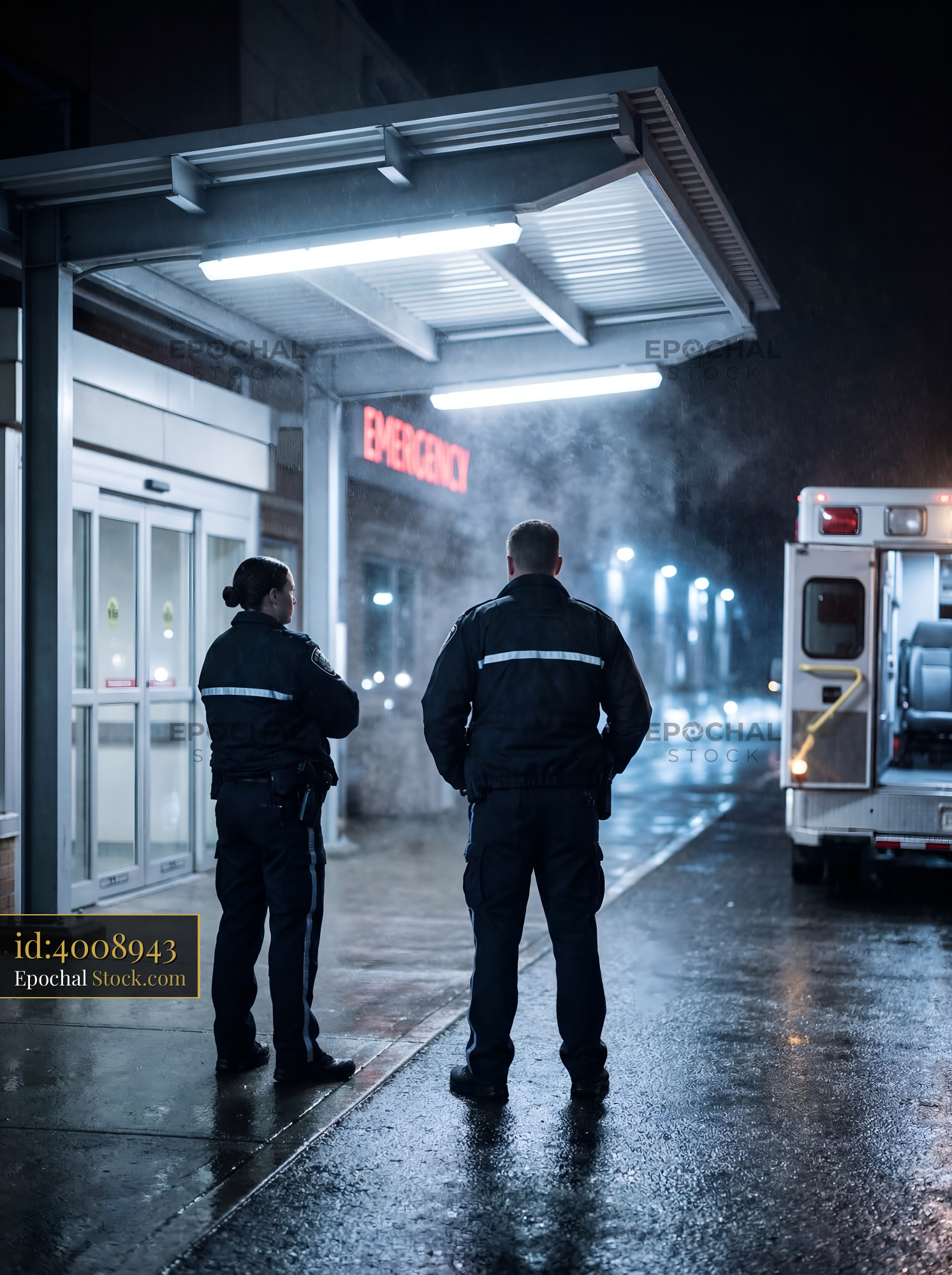Two police officers stand outside the emergency entrance at night. An ambulance is parked nearby under a lit awning. Rain creates reflections on the wet ground.