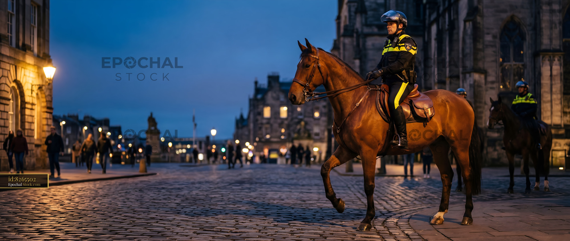 A police officer is riding a horse in the city square at night. There are other officers, people walking, and city buildings lit up in the background. The cobblestone street is visible.
