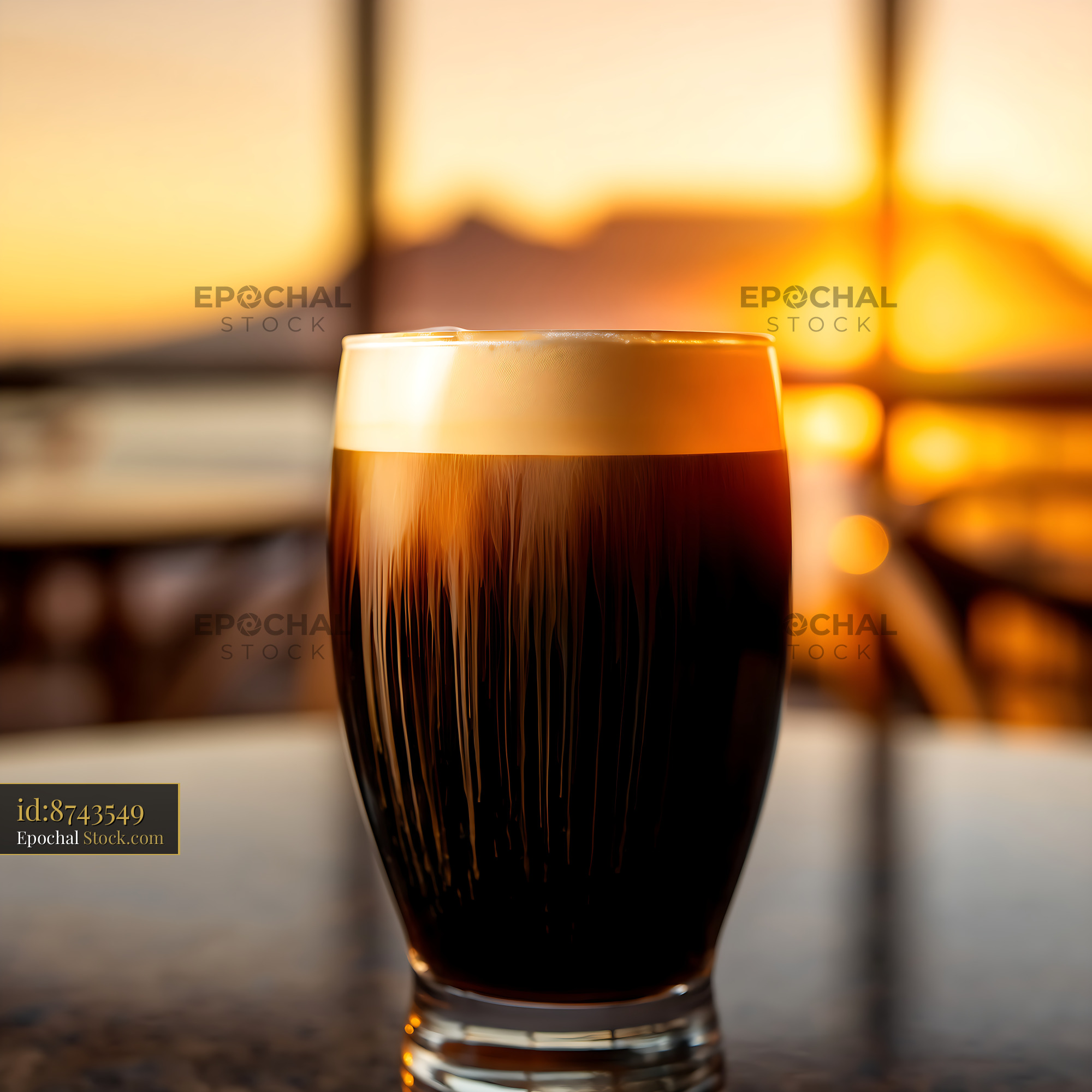 A perfectly poured nitro caramel coffee showcases the signature thick, creamy tan head characteristic of nitrogen-infused beverages, sharply contrasting with the deep dark liquid below. Captured during golden hour with warm sunset backlighting, the glass sits on a minimalist surface, creating an inviting, premium atmosphere that evokes sophistication and artisanal craftsmanship. This image is ideal for specialty coffee shop marketing campaigns, cafe menu boards, coffee brand packaging, beverage product advertising, and social media content for independent roasters. Perfect for hospitality websites, lifestyle blogs, barista training materials, and high-end restaurant or coffeehouse promotional materials.