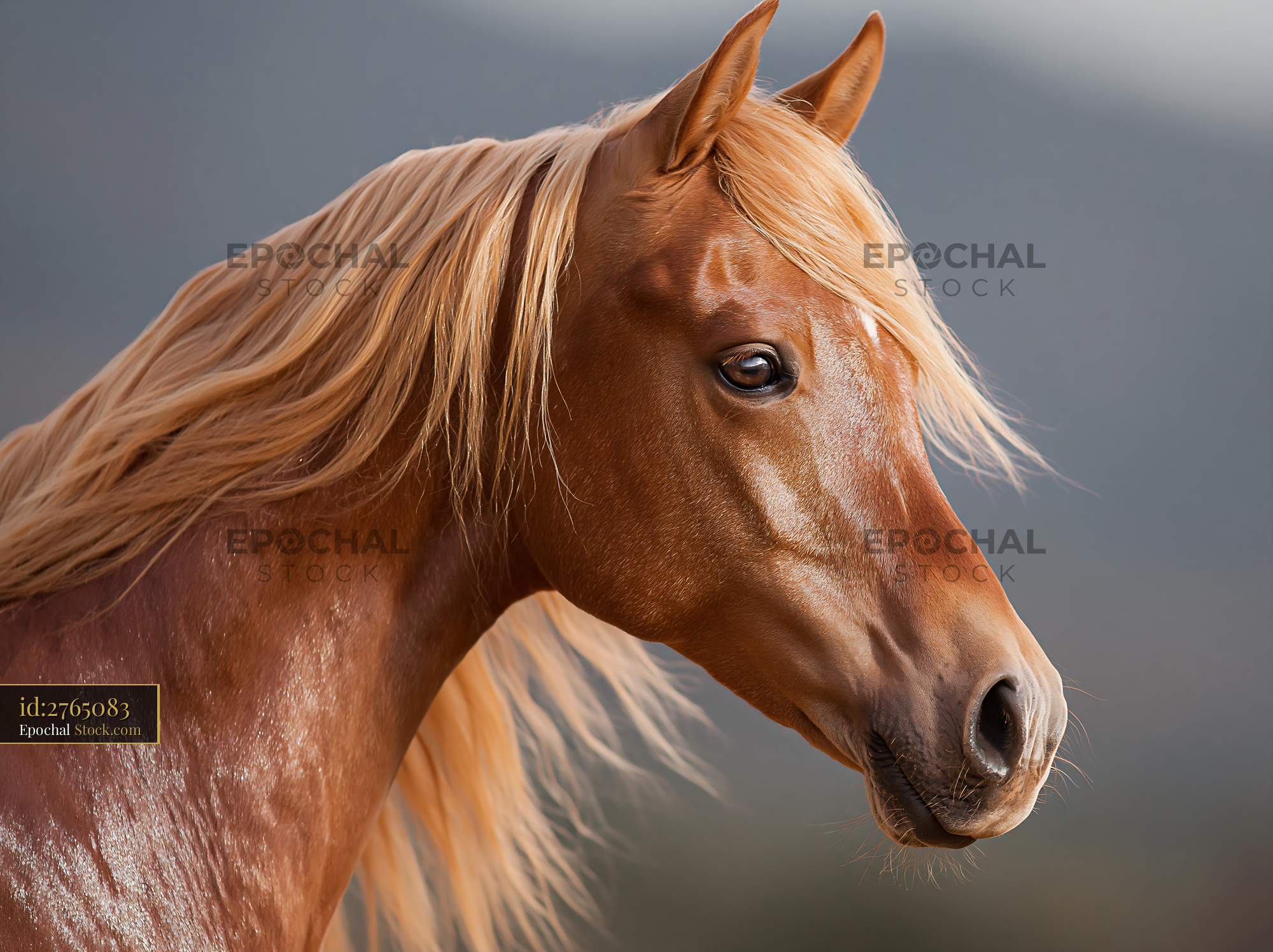 Noble chestnut horse with flaxen mane against a blurred background