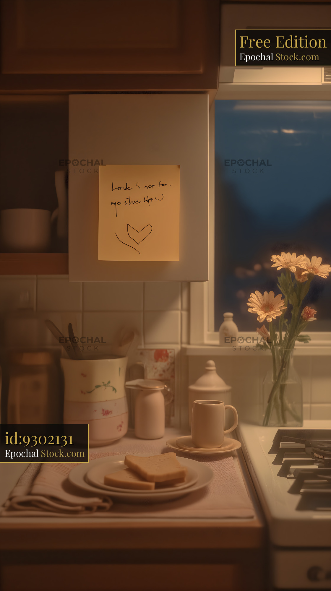 In a quiet kitchen, a note is placed on a cabinet. A vase holds flowers nearby. A plate with food sits on the table. Soft light comes through the window during the evening.