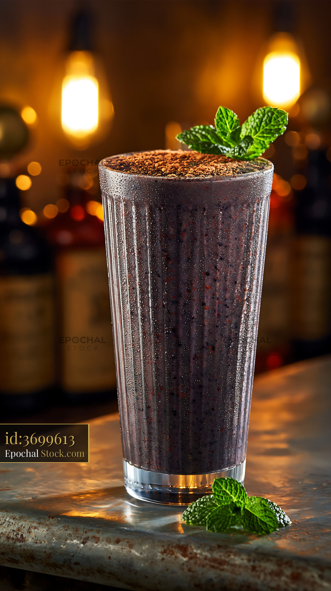 Nutritious black bean smoothie with mint and cocoa in a rustic bar