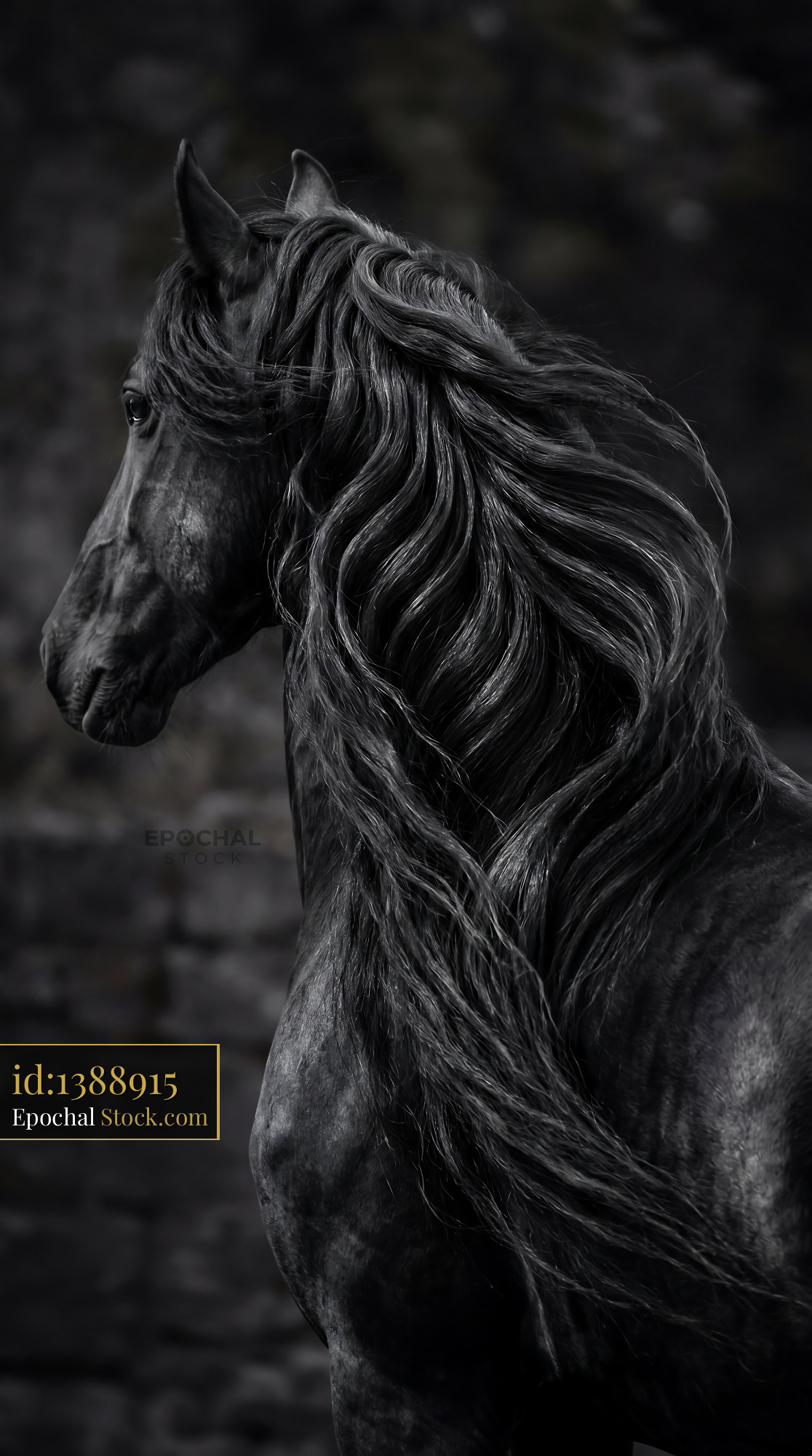 Dramatic monochromatic Friesian horse mane with a liquid silk texture. Ideal for luxury wallpaper, sophisticated apparel, and statement home decor accents.