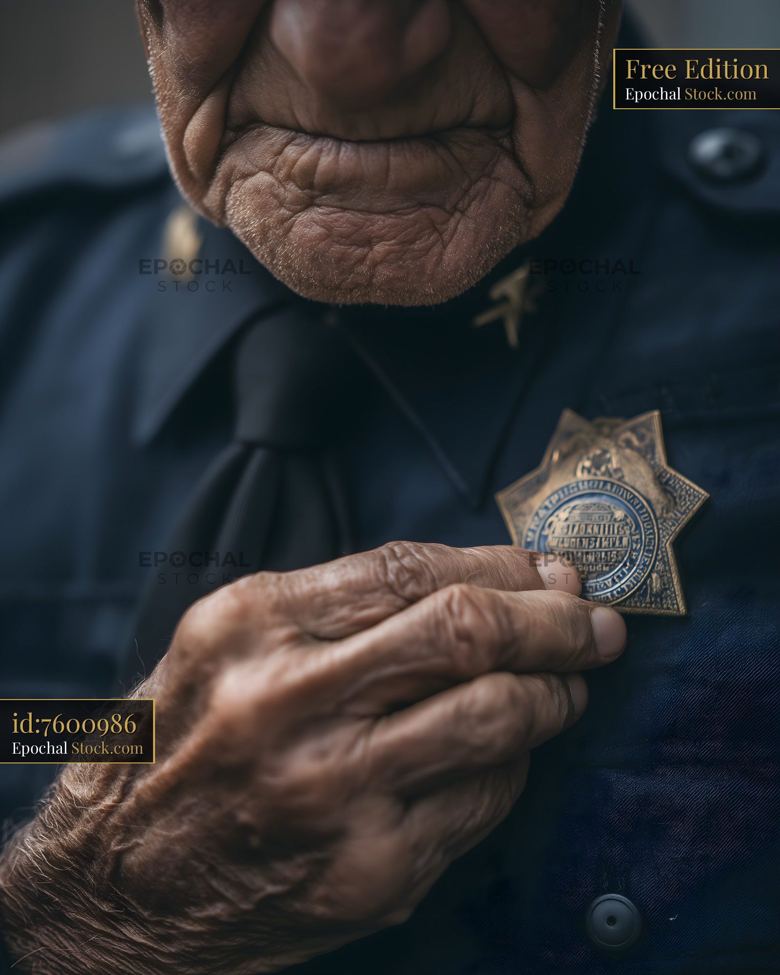 Old officer adjusts badge on uniform during quiet moment Free Premium Stock Image