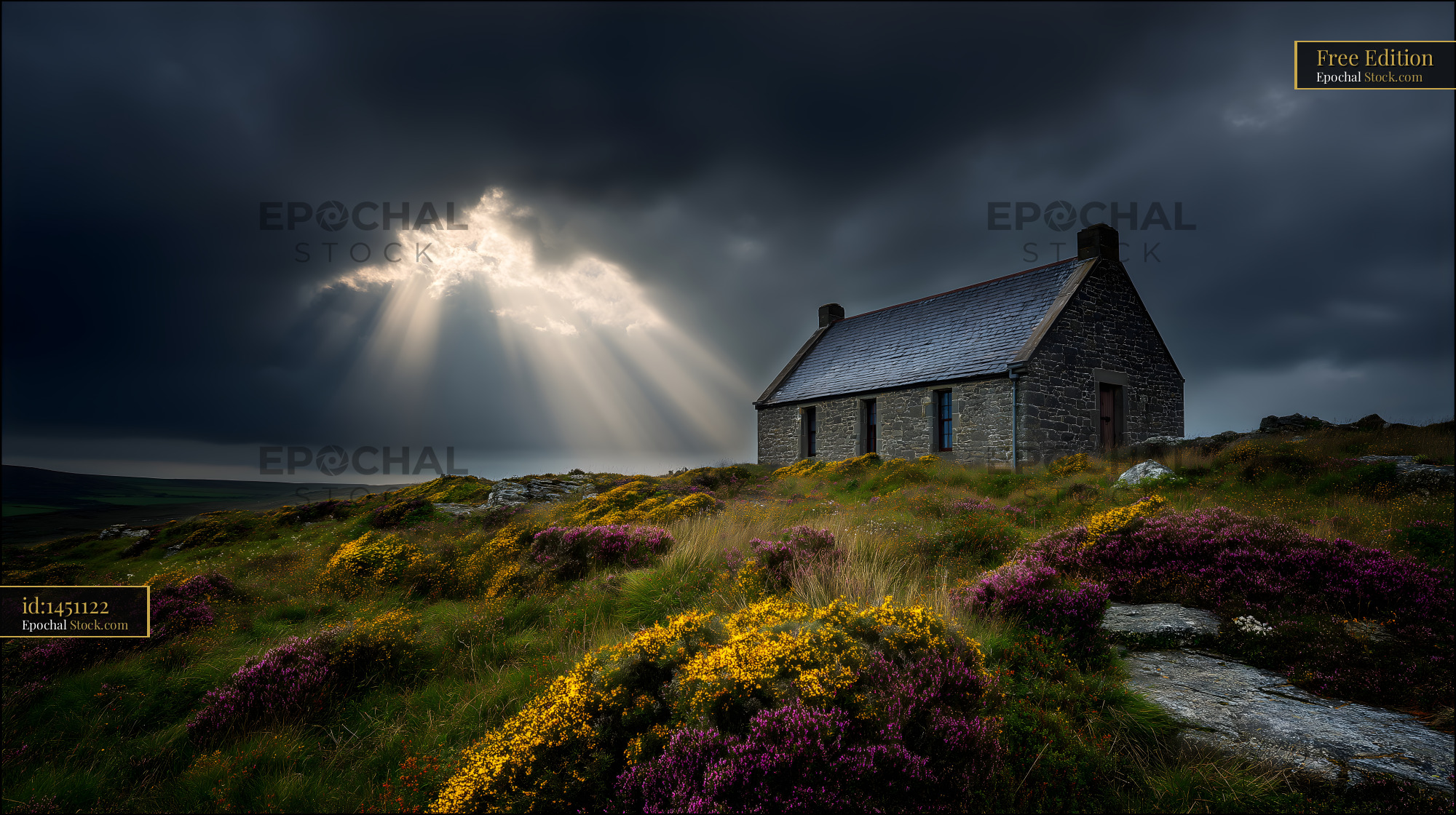 A stone house sits on a hill surrounded by grass and flowers. Dark clouds cover the sky, but rays of light shine through, creating a striking view. The scene shows nature and a simple building.