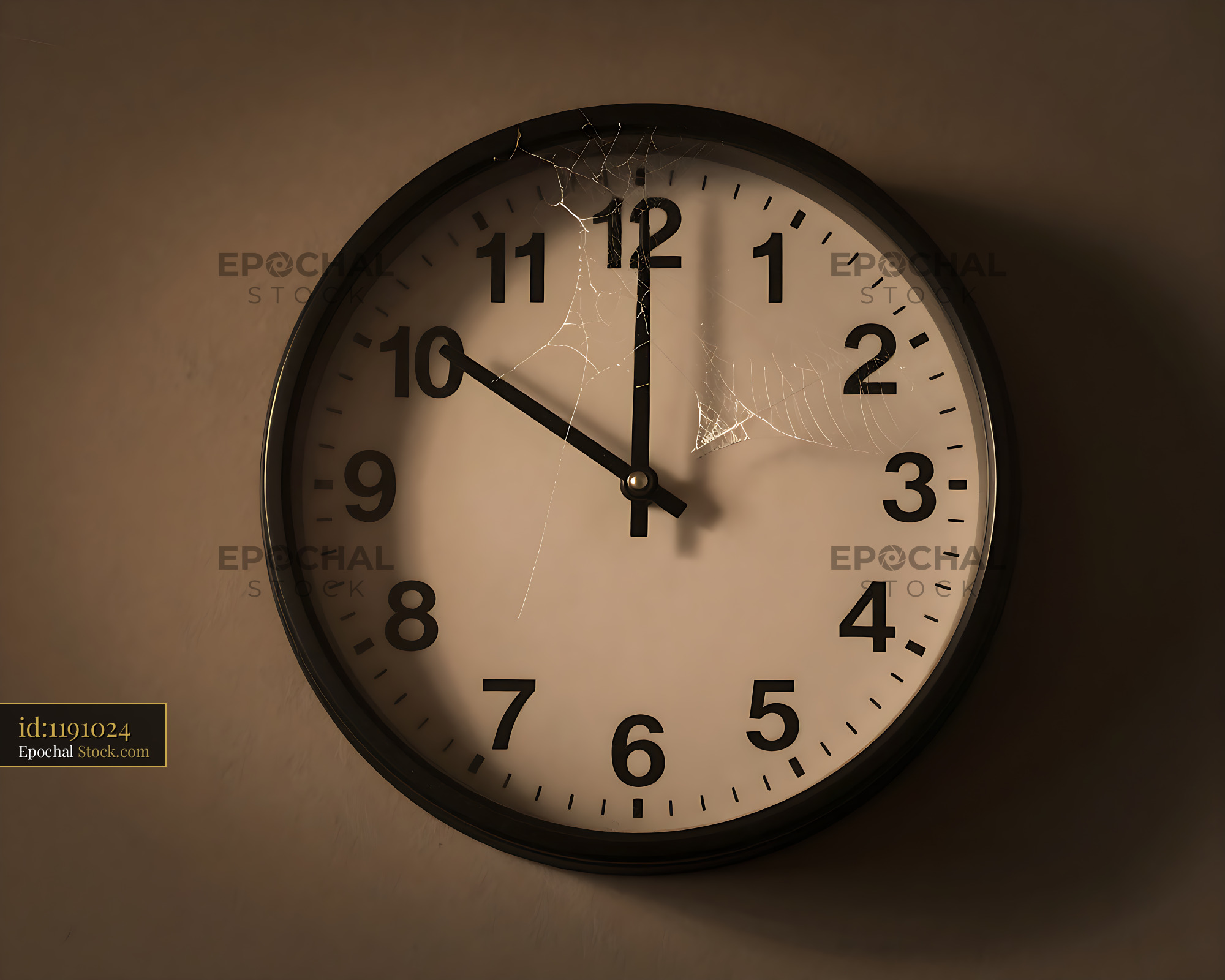 A dusty analog wall clock covered in delicate spiderwebs hangs in low light, evoking themes of neglect, the passage of time, and forgotten history.