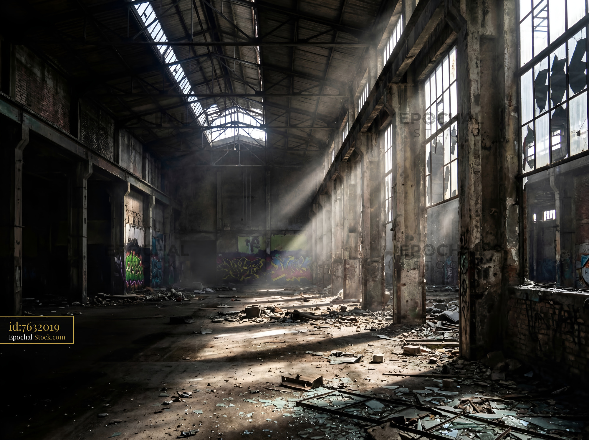 Dust fills the air inside an empty warehouse. Sunlight streams through broken windows, illuminating the debris scattered across the floor. Graffiti marks the walls in various colors.