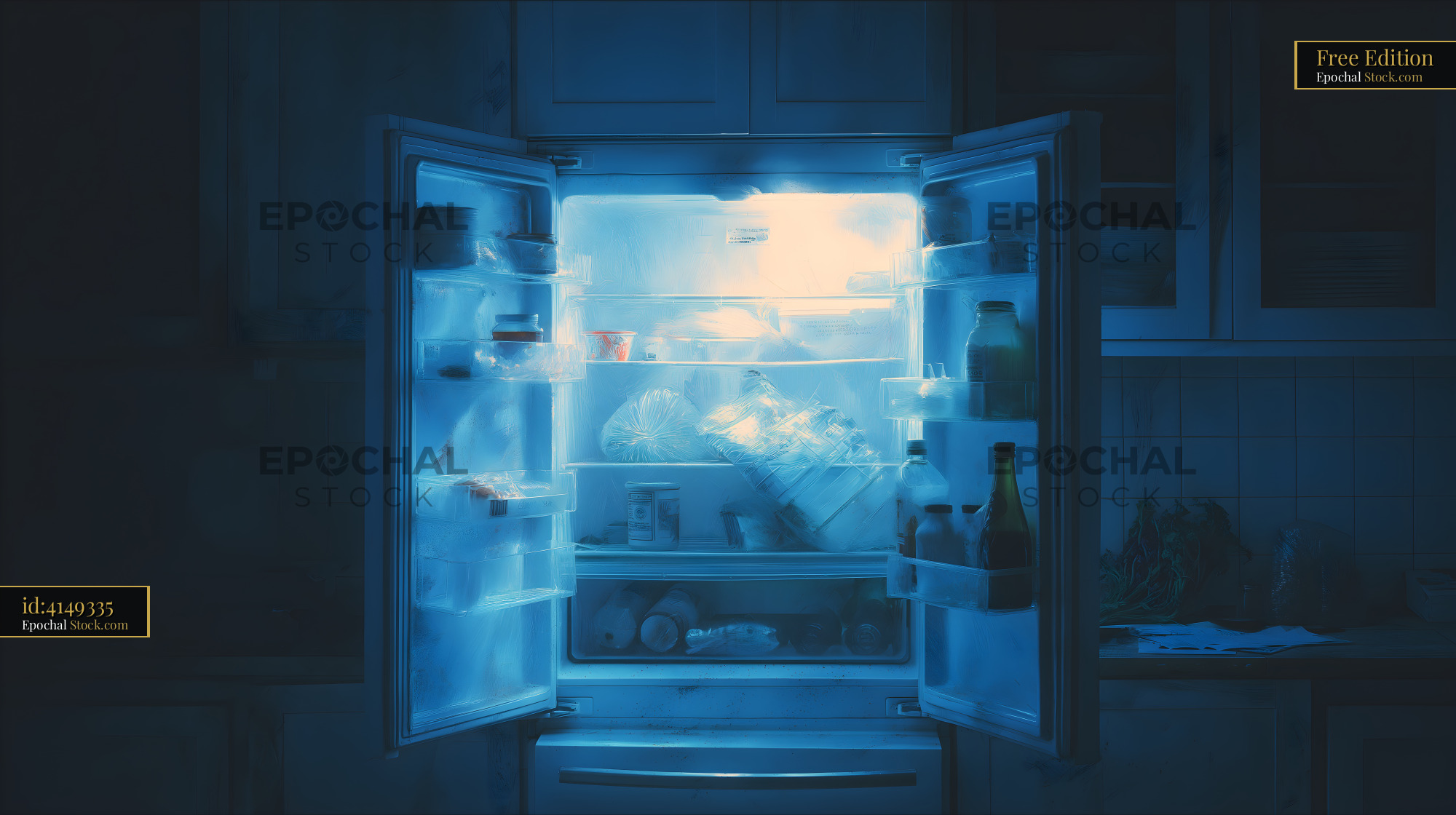 Open fridge at night in dimly lit kitchen Free Premium Stock Photo