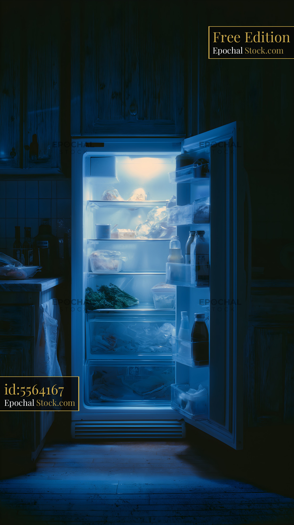 Open refrigerator at night with blue light in kitchen Free Premium Stock Photo