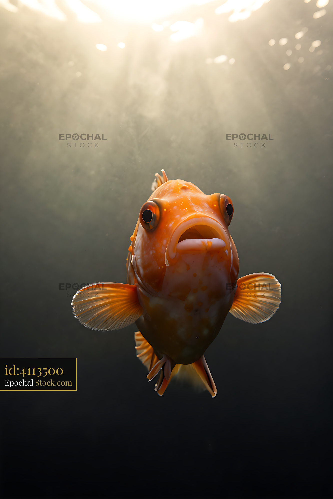 A vibrant orange fish swims gracefully through dark, deep water, illuminated by a soft, ethereal light from above, capturing a moment of serenity and natural mystery.