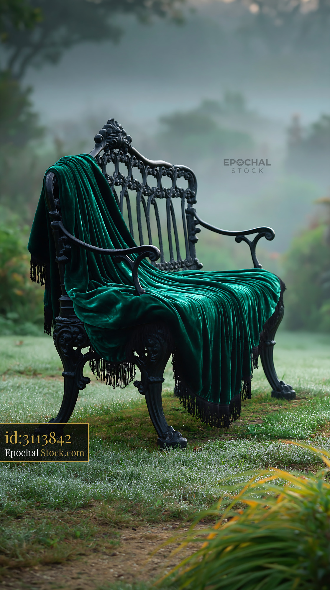 A luxurious green velvet blanket draped over an ornate wrought iron bench in a foggy morning park, evoking themes of solitude, absence, and quiet nostalgia.