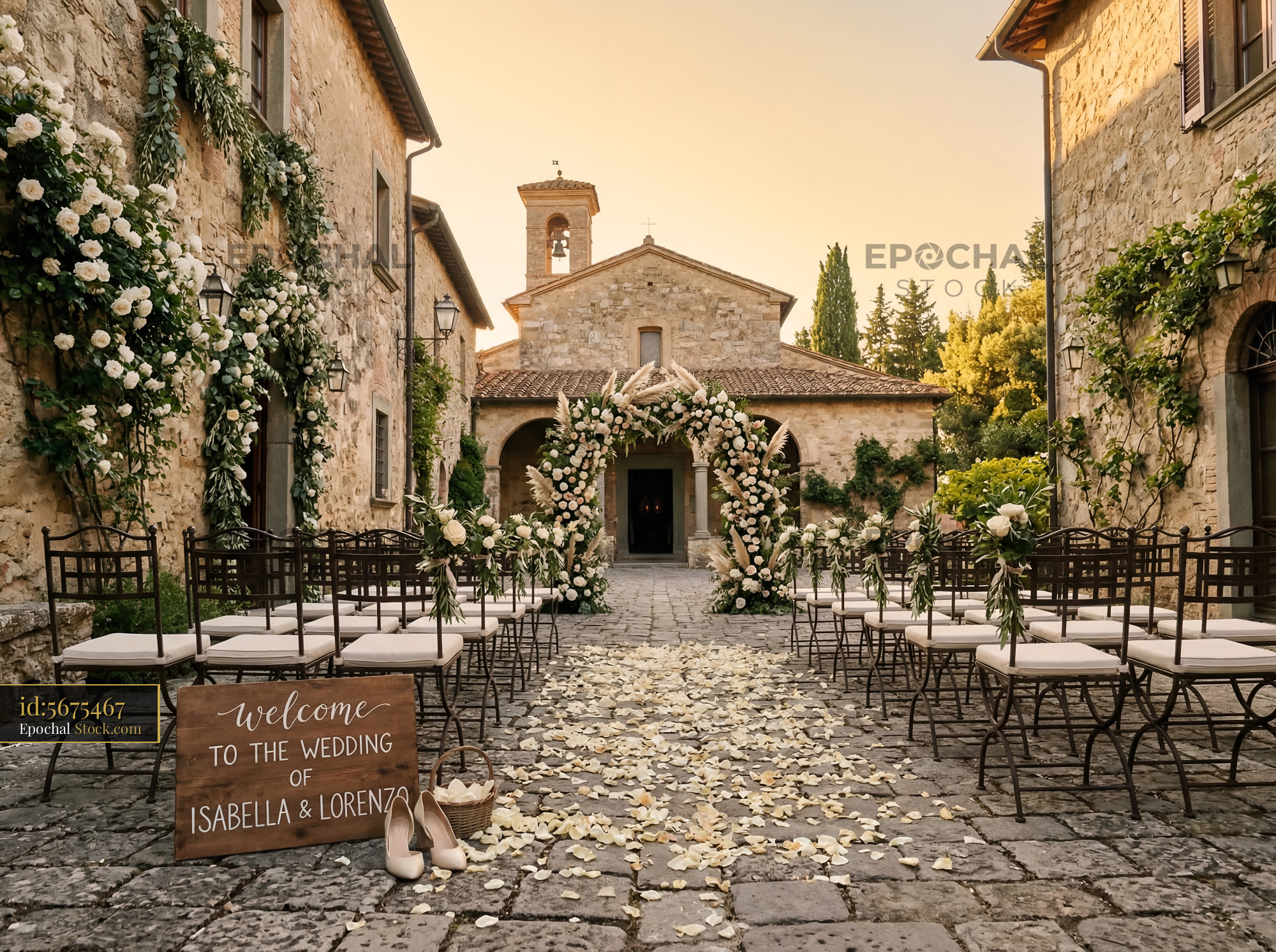 The scene shows a wedding setup with rows of chairs arranged in an outdoor area. A floral archway leads to a building in the background. A sign welcomes guests to the event.