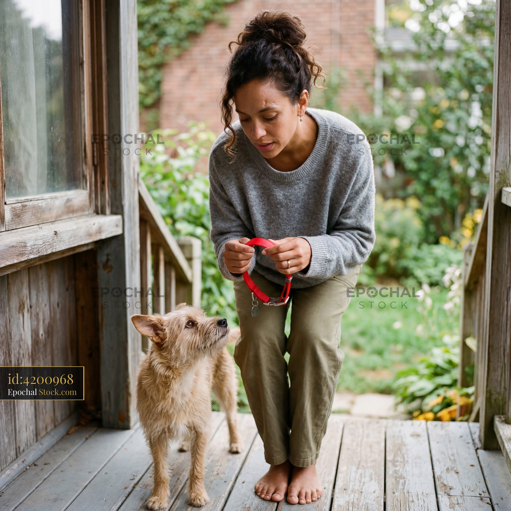 Owner prepares to walk dog at home entrance Premium Stock Image