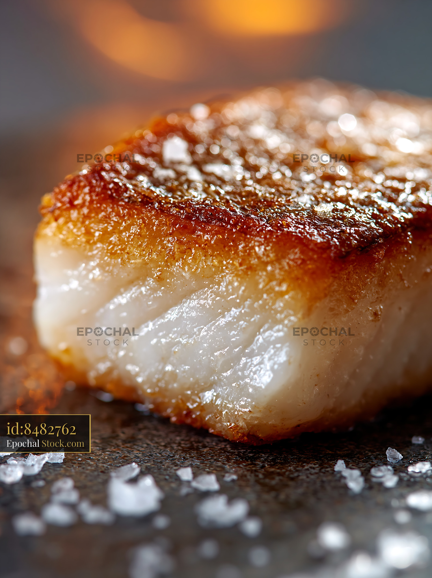 A perfectly seared white fish fillet with a golden crispy crust and flaky interior, seasoned with coarse sea salt, evoking themes of gourmet cooking and culinary excellence.