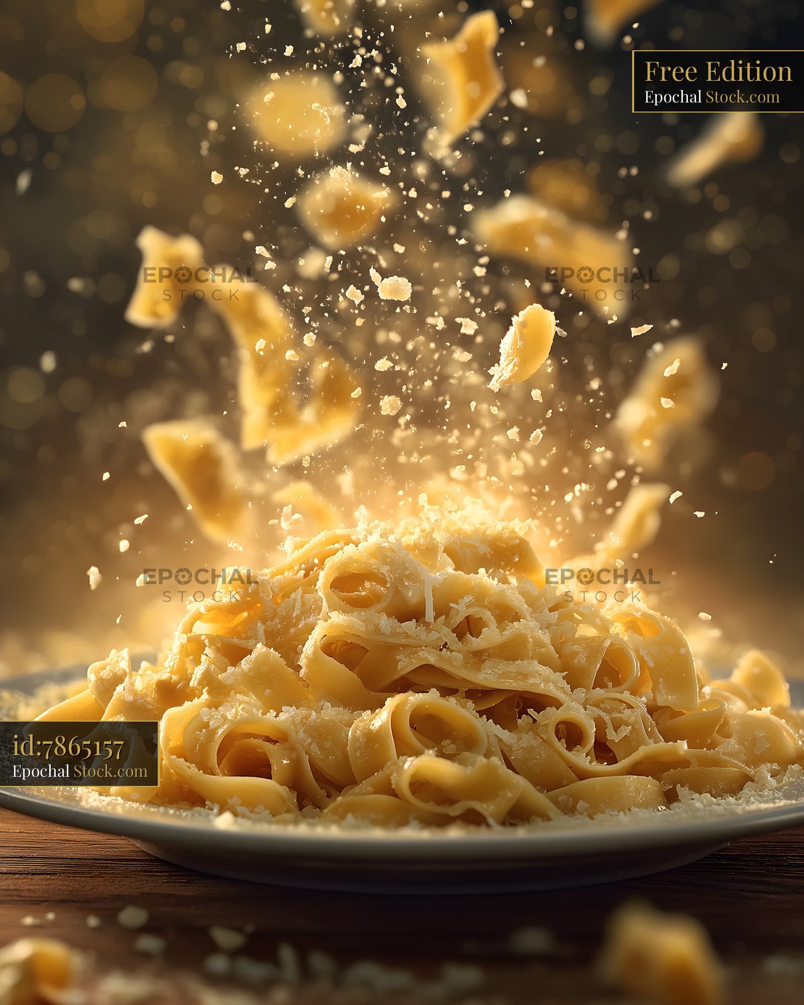 A plate of pasta sits on a wooden table. Shreds of cheese fall from above, creating a fun and lively scene in a kitchen. Light shines on the cheese and pasta, adding energy.