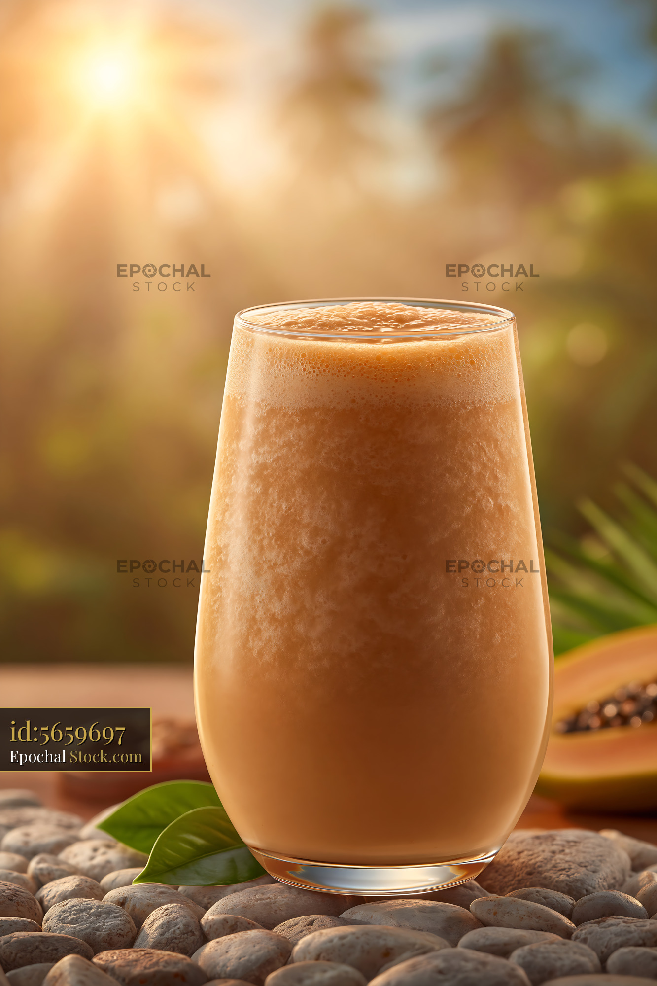 A refreshing pawpaw punch milkshake served in a glass on natural stones, bathed in warm golden hour sunlight, evoking a tropical, healthy, and relaxing vacation atmosphere.