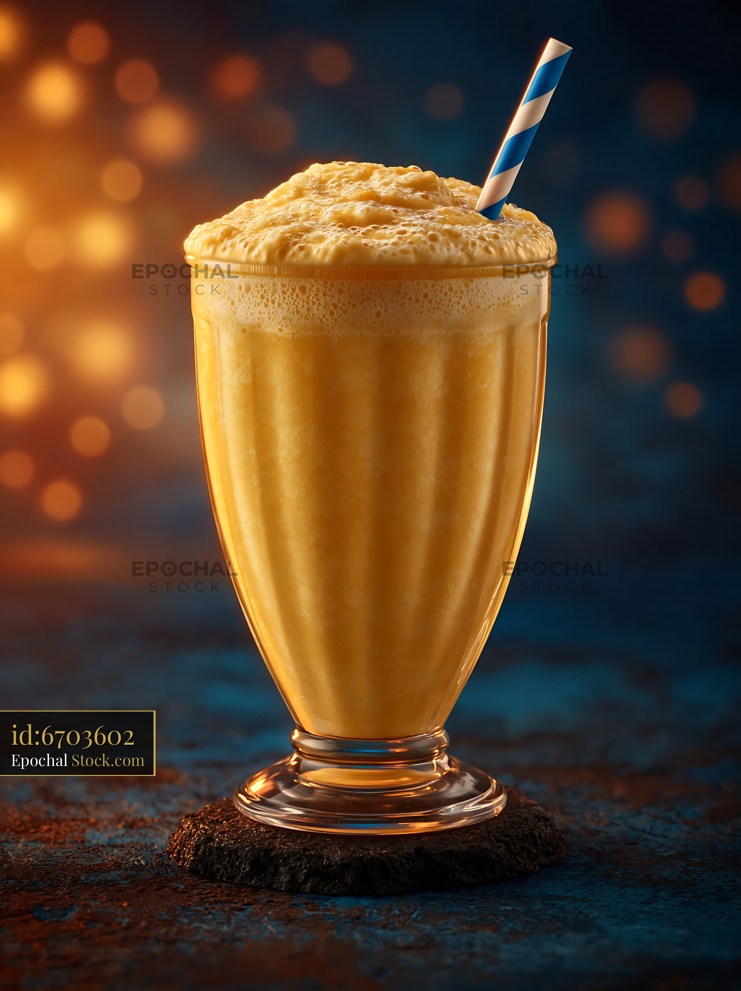 A refreshing pawpaw punch milkshake served in a classic glass with a striped straw, glowing against a moody, bokeh-lit background. This image captures the essence of indulgent comfort and flavor.