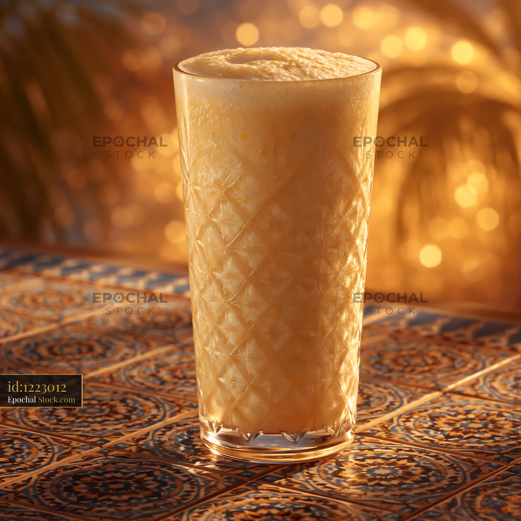 A refreshing pawpaw punch milkshake served in a decorative crystal glass, standing on a colorful mosaic tile table during a warm golden hour, evoking feelings of tropical summer relaxation.