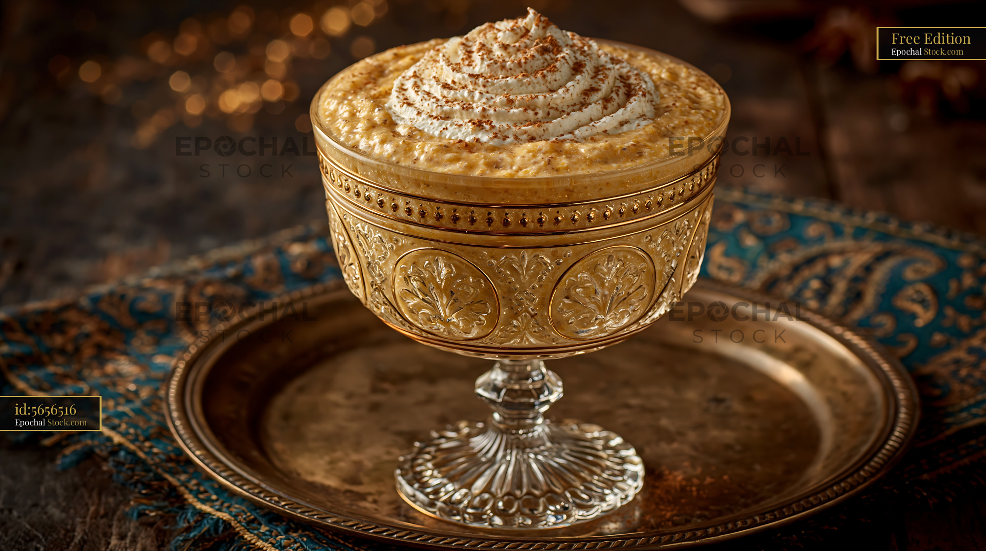 A rich and creamy pawpaw punch milkshake topped with whipped cream and cinnamon, served in an elegant vintage crystal goblet on a metallic tray, evoking a sense of exotic comfort and indulgence.