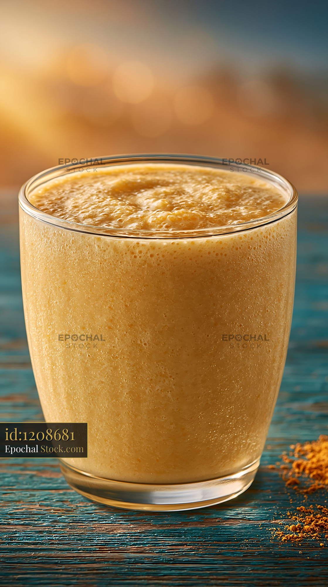 A vibrant pawpaw punch milkshake sits on a rustic blue wooden table, illuminated by the warm glow of sunset, capturing a moment of tropical refreshment and healthy living.