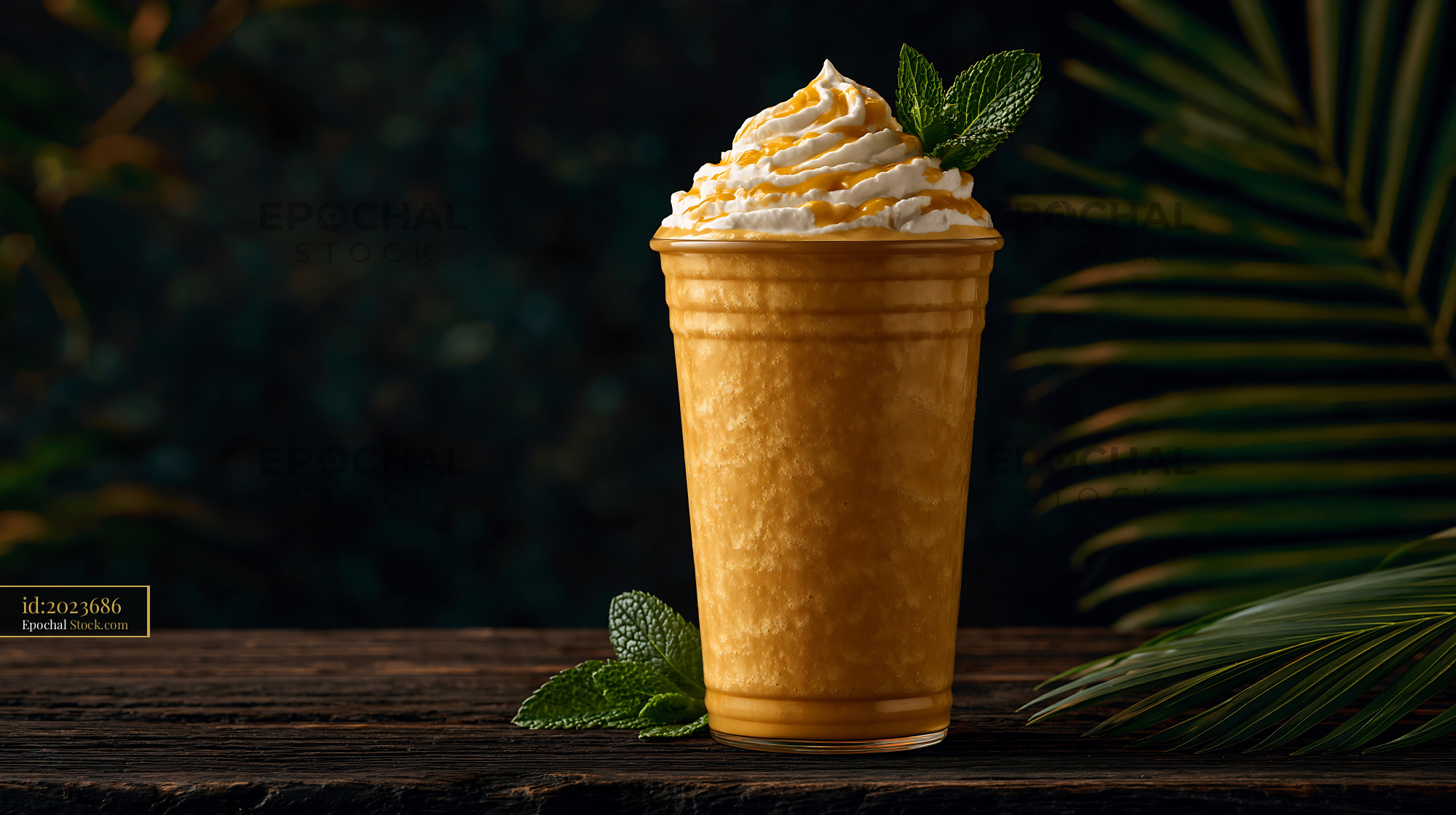 A refreshing pawpaw punch milkshake served in a plastic cup, topped with whipped cream, caramel drizzle, and fresh mint leaves on a rustic wooden table, evoking a tropical summer vibe.