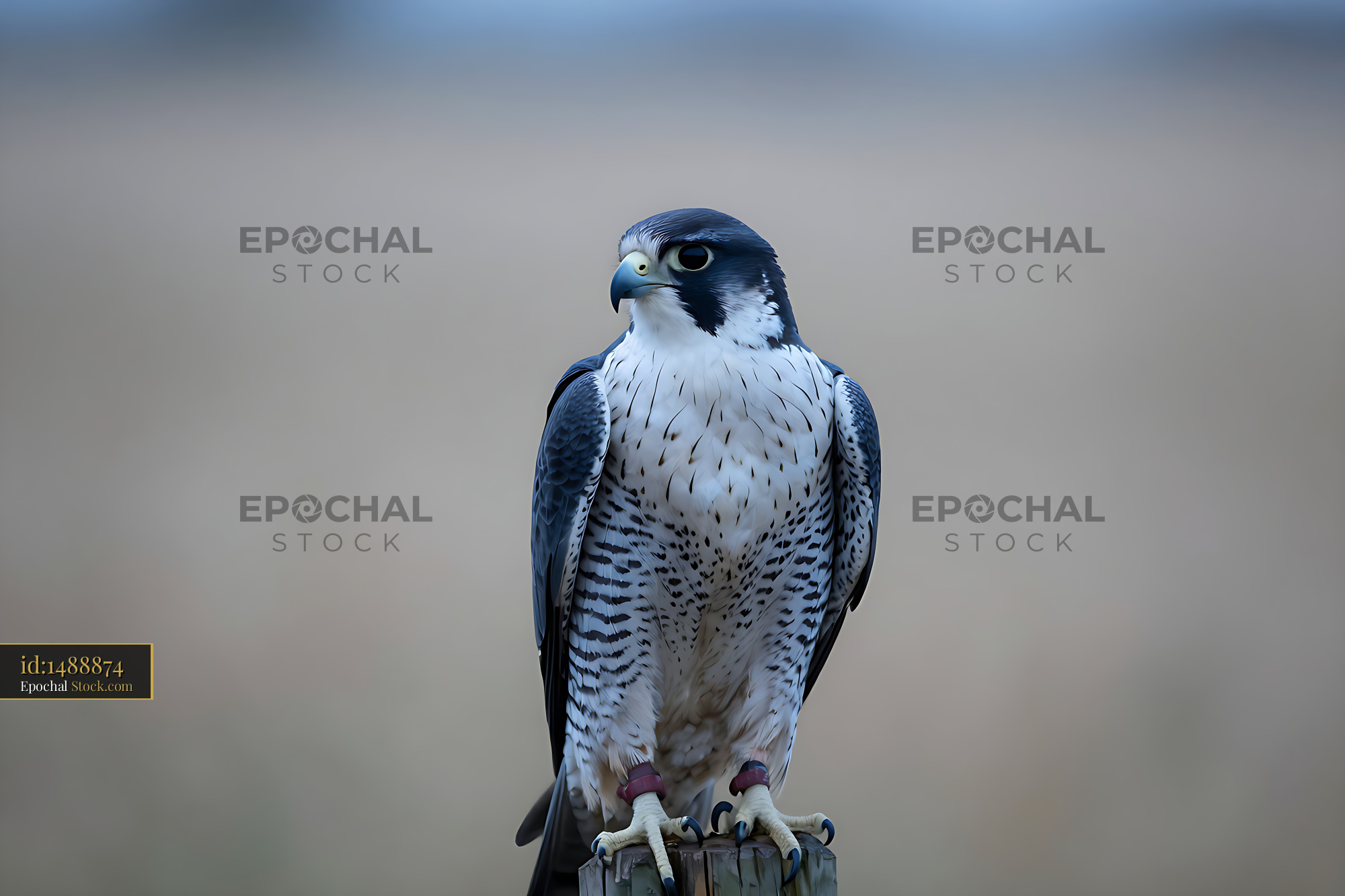 Peregrine falcon perched on a wooden post against a soft background