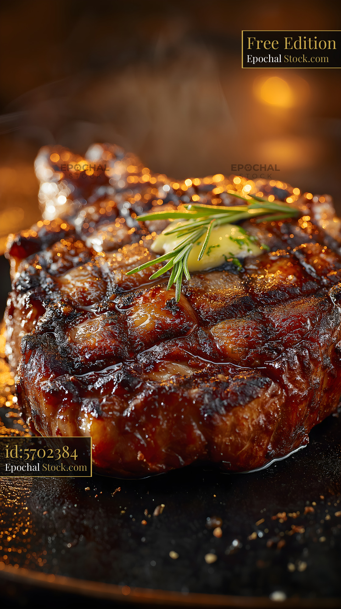 A thick piece of steak sits on a black plate. The steak shows grill marks and has herbs on top. It is resting, ready to be served. The setting has warm light around it.