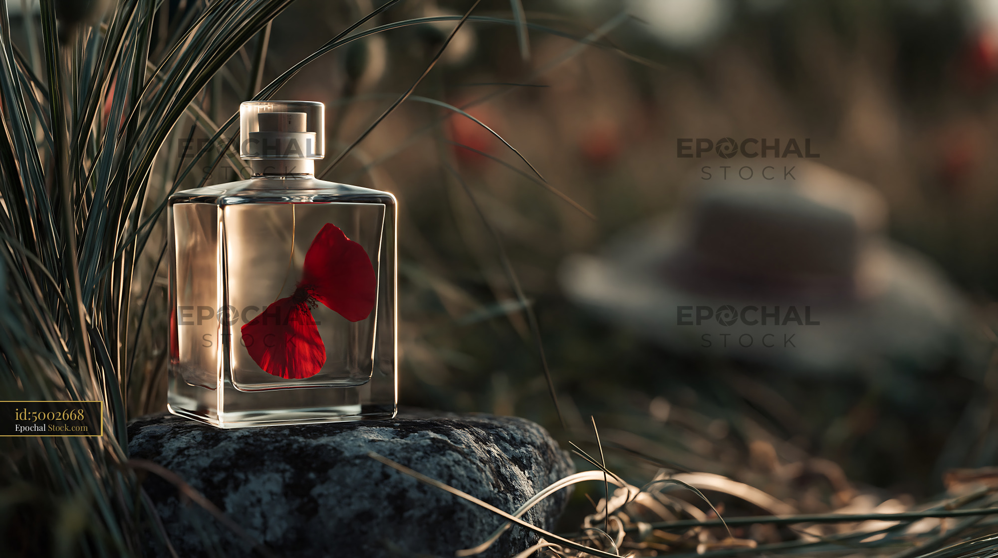 A transparent perfume bottle with a red poppy petal inside rests on a rock during golden hour, evoking a sense of natural beauty, floral fragrance, and summer memories.