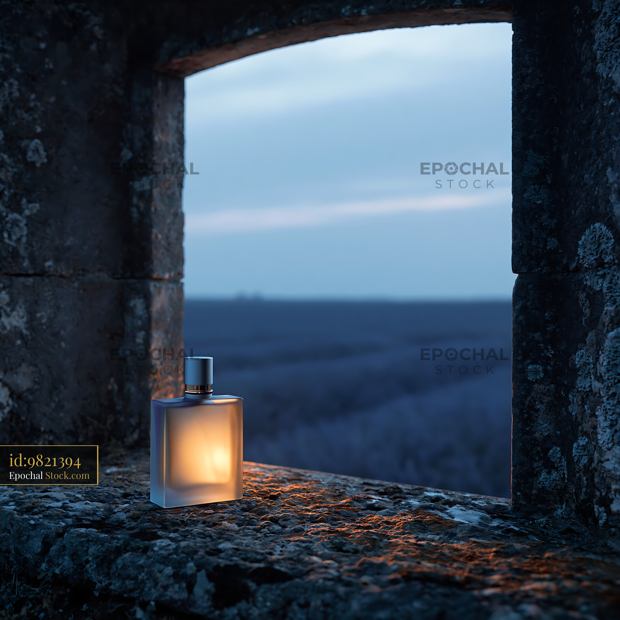 A frosted glass perfume bottle radiates a warm golden light on a weathered stone ledge, overlooking a vast landscape under a deep blue twilight sky, evoking mystery and timeless luxury.