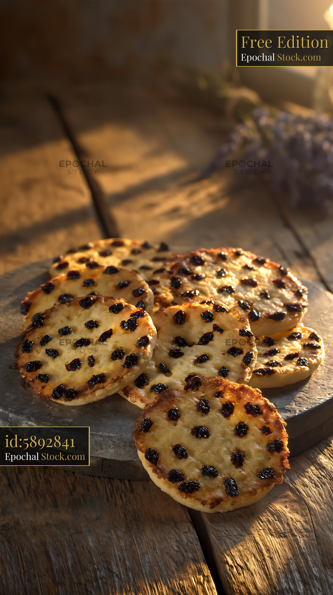 Traditional Persian raisin cookies on a stone plate, bathed in warm afternoon sunlight, evoking a sense of cozy tradition, nostalgia, and homemade comfort.