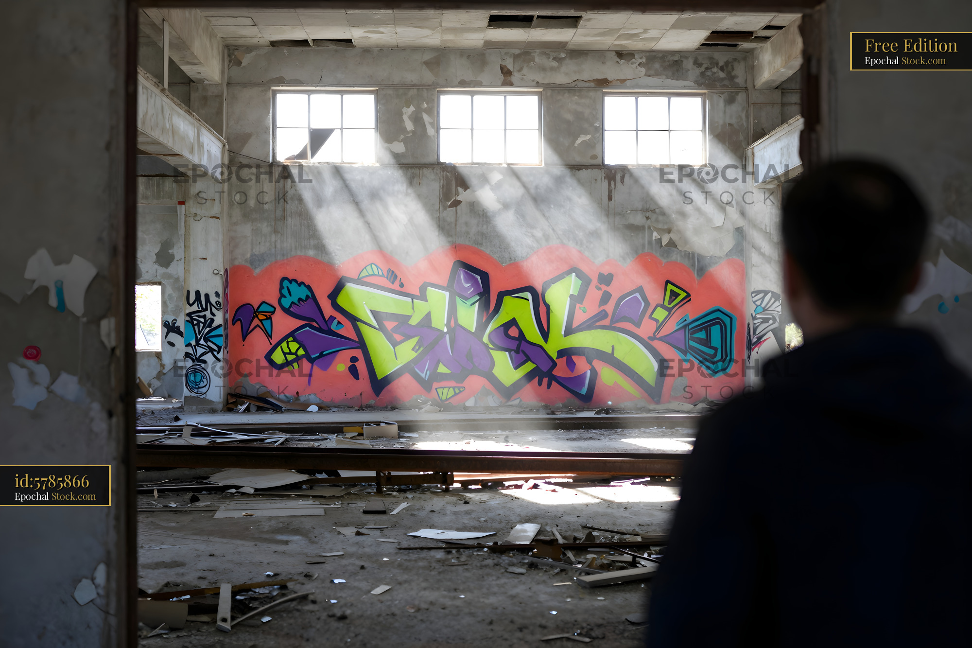 A person stands in an abandoned building and looks at colorful graffiti on the wall. Sunlight enters through the windows and creates bright spots on the ground.