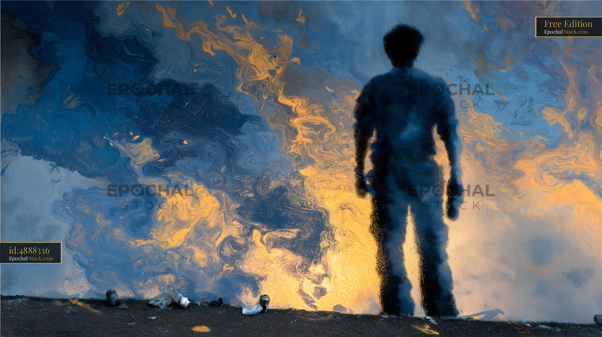 A person stands near a body of water, looking at colorful reflections during dusk. The scene shows the silhouette of the person against the vibrant hues in the water.