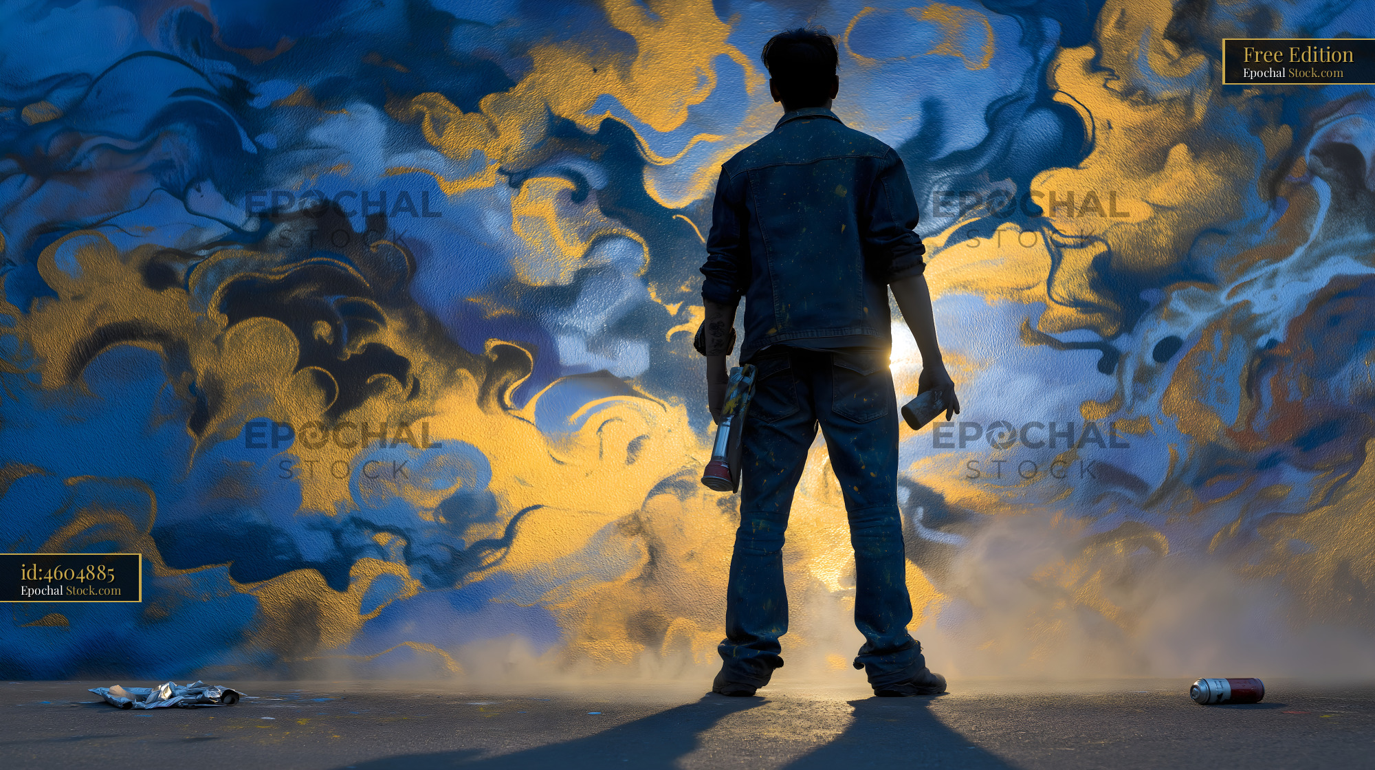 A person stands in front of a large wall, holding spray cans. They look at the colorful mural they are creating with blue and yellow tones. The scene shows the artistic process in action.