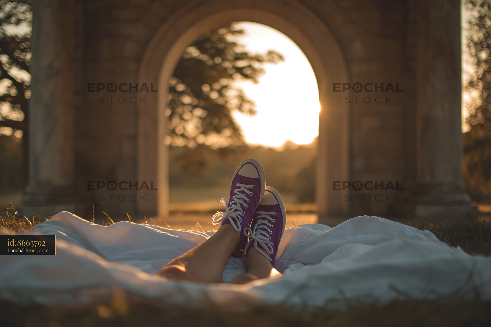 A person relaxes on a white blanket wearing purple sneakers, enjoying the warm golden hour light through a stone archway, capturing a sense of freedom and summer tranquility.