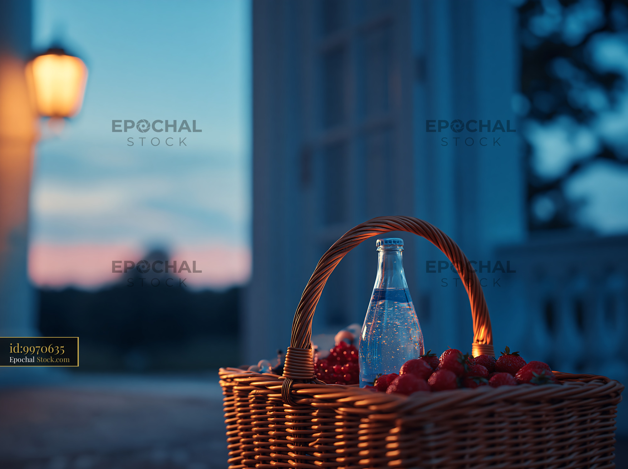 A wicker picnic basket with fresh strawberries and sparkling water sits on a terrace at dusk, evoking a sense of summer evening relaxation and romantic outdoor dining.
