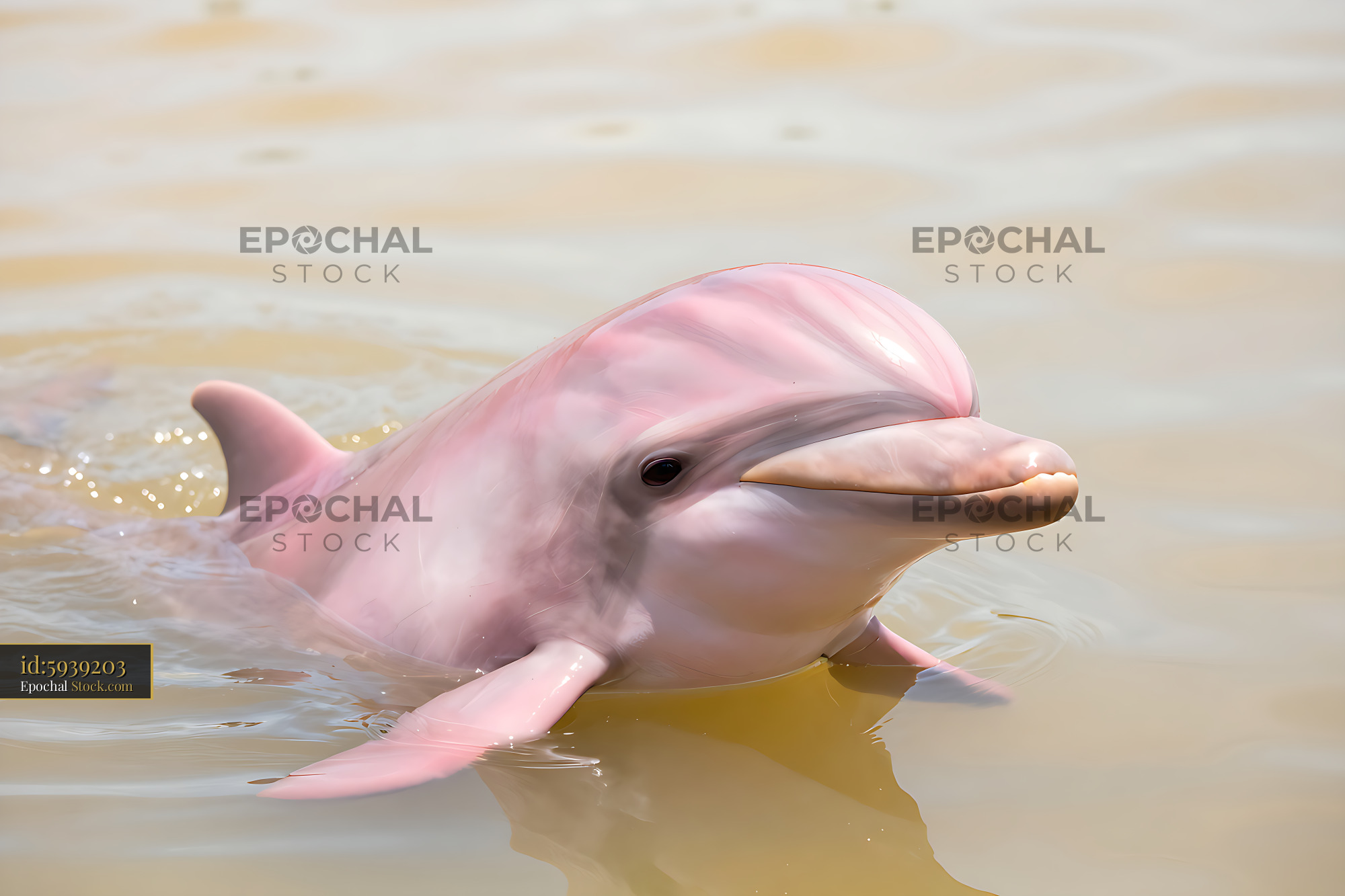 A rare pink Amazon river dolphin, or Boto, swims through murky river water, capturing a moment of curiosity and highlighting the beauty of endangered tropical wildlife.
