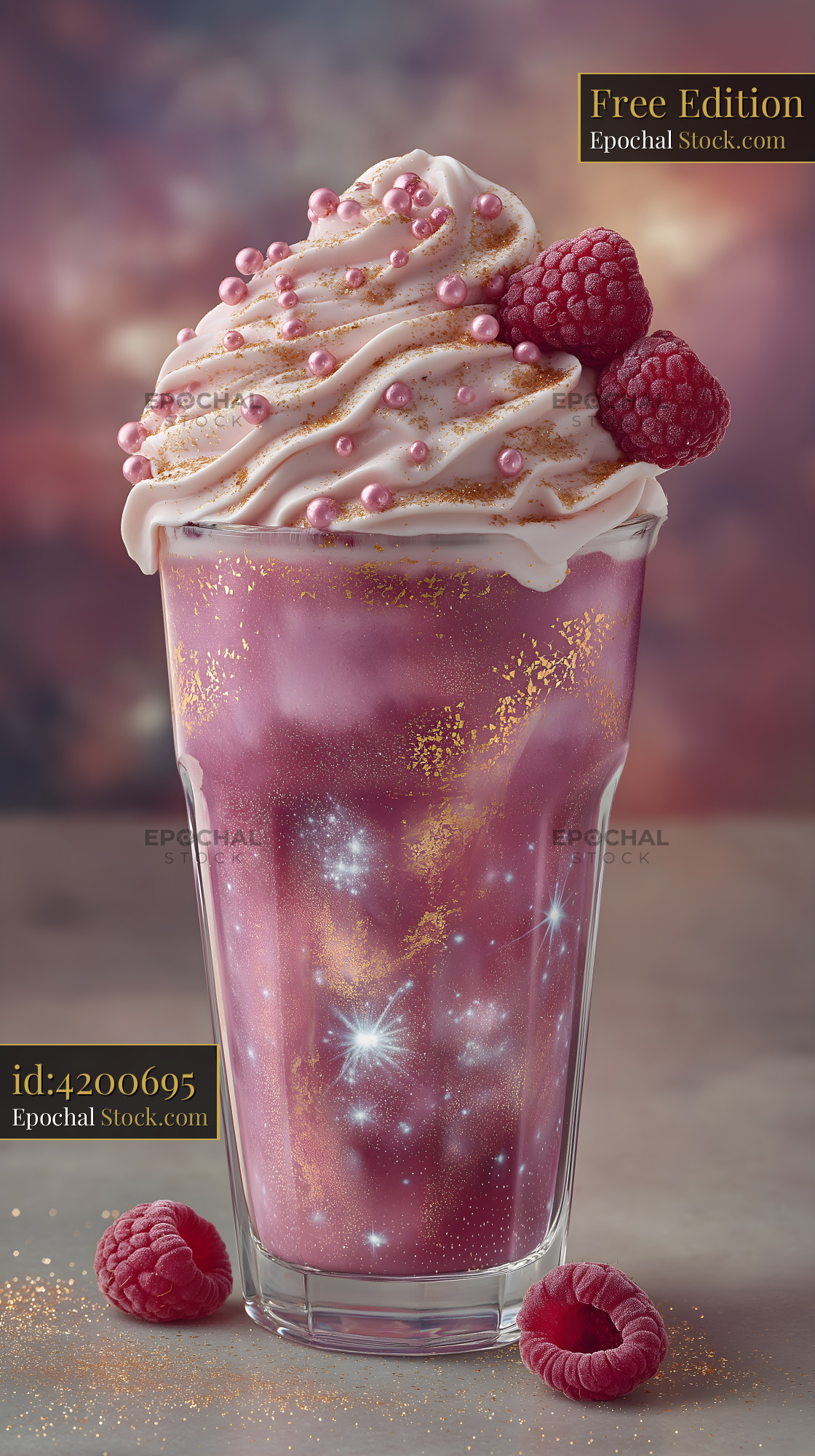 A tall glass holds a pink drink topped with whipped cream and raspberries. The drink features sparkles and a smooth texture. Raspberries are placed beside the glass, on a table.