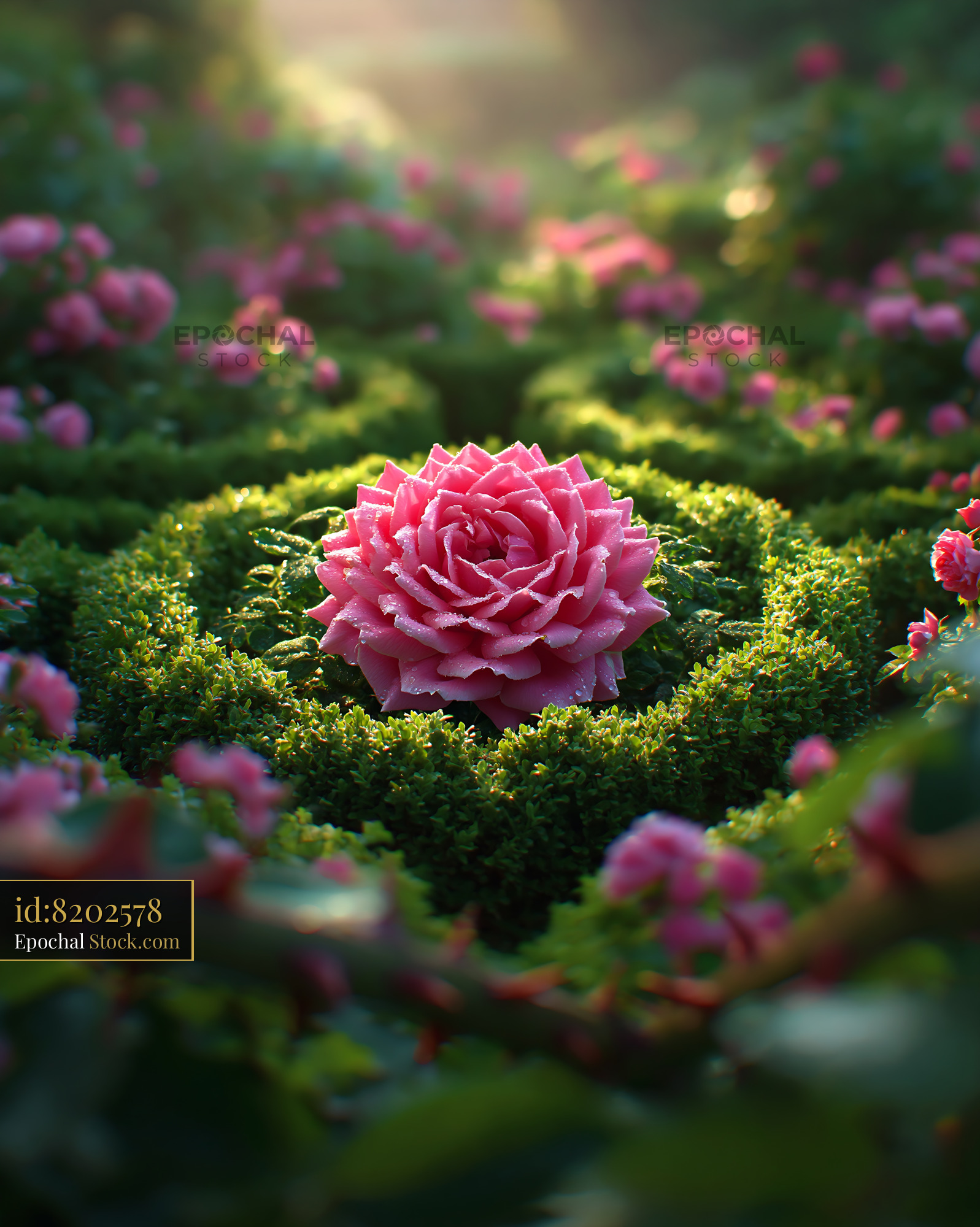 A vibrant pink rose sits centered in a manicured boxwood circle, covered in morning dew. It evokes the elegance of formal English garden design and the quiet beauty of a summer morning.