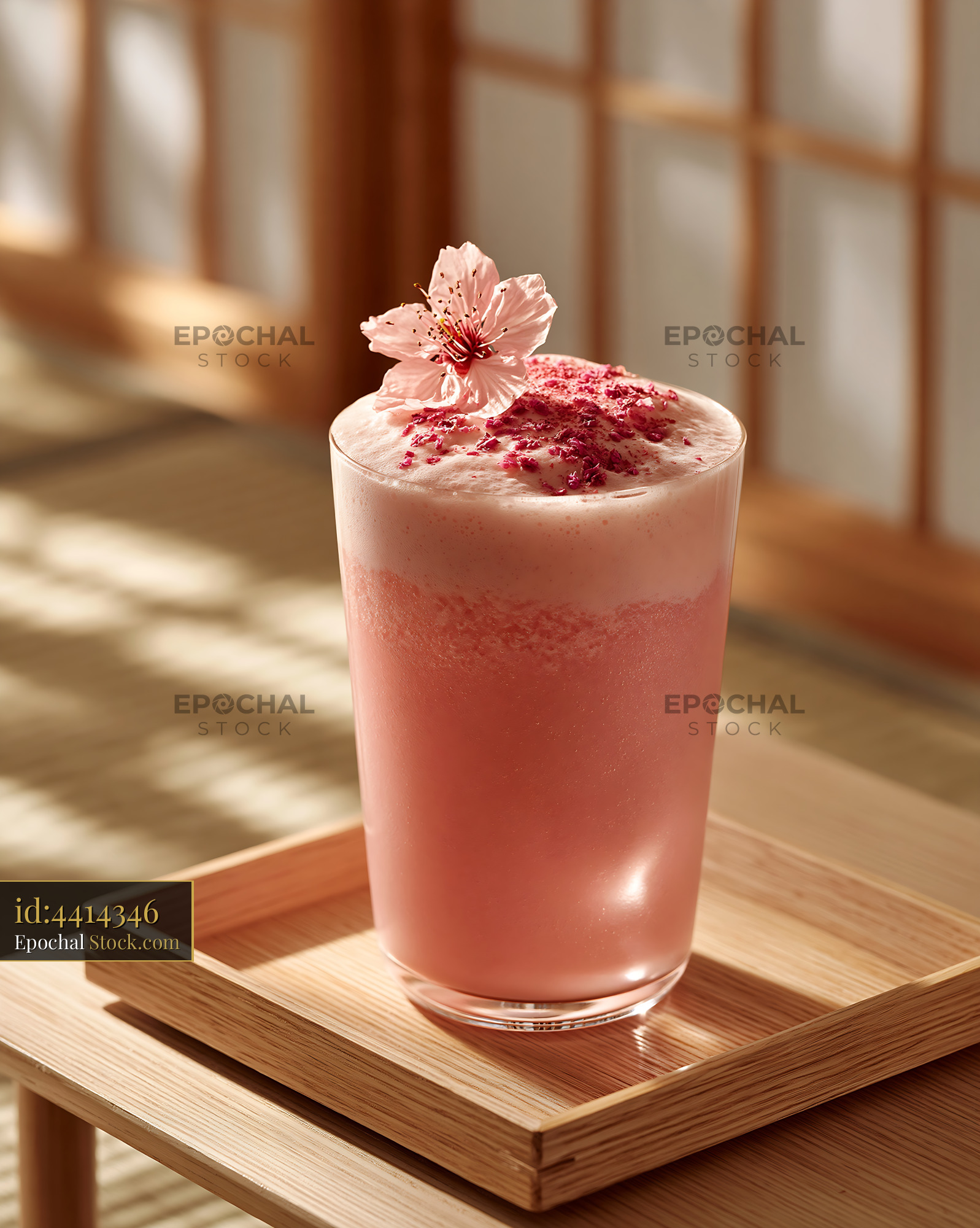A refreshing pink cherry blossom smoothie served on a wooden tray in a sunlit Japanese room, capturing the essence of spring, zen aesthetics, and seasonal flavors.