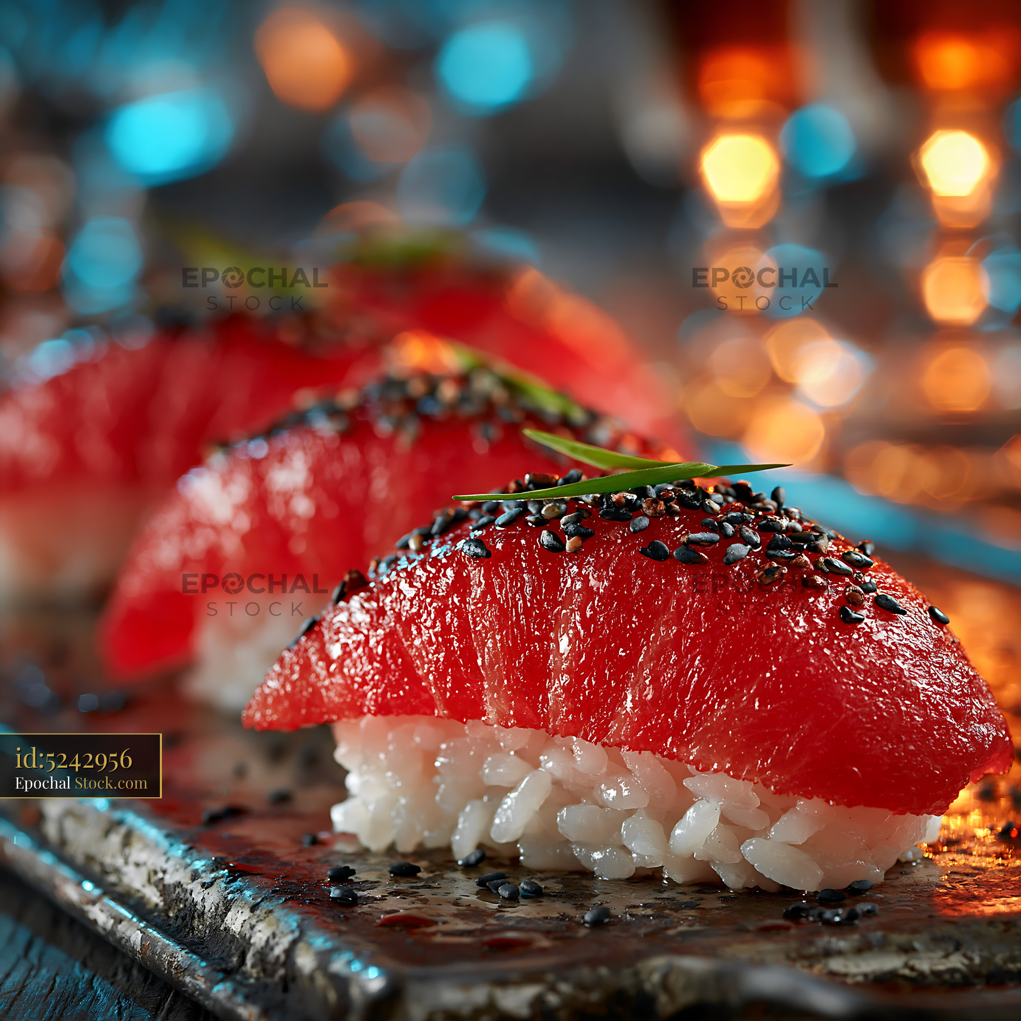 A row of innovative watermelon tuna sushi nigiri topped with black sesame, capturing the essence of modern plant-based fine dining amidst vibrant city lights.