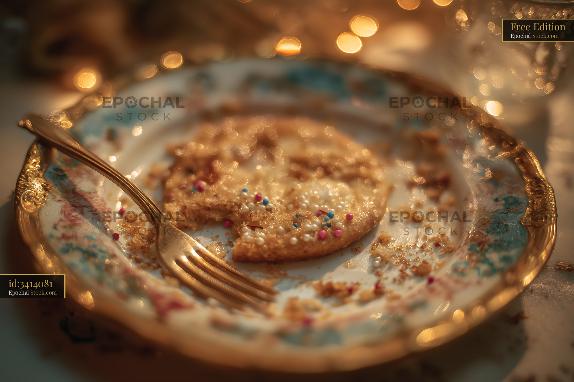 A decorative plate holds crumbs from a cookie, showing the remnants of a sweet treat. A fork rests beside the plate, hinting at a recent dessert experience.